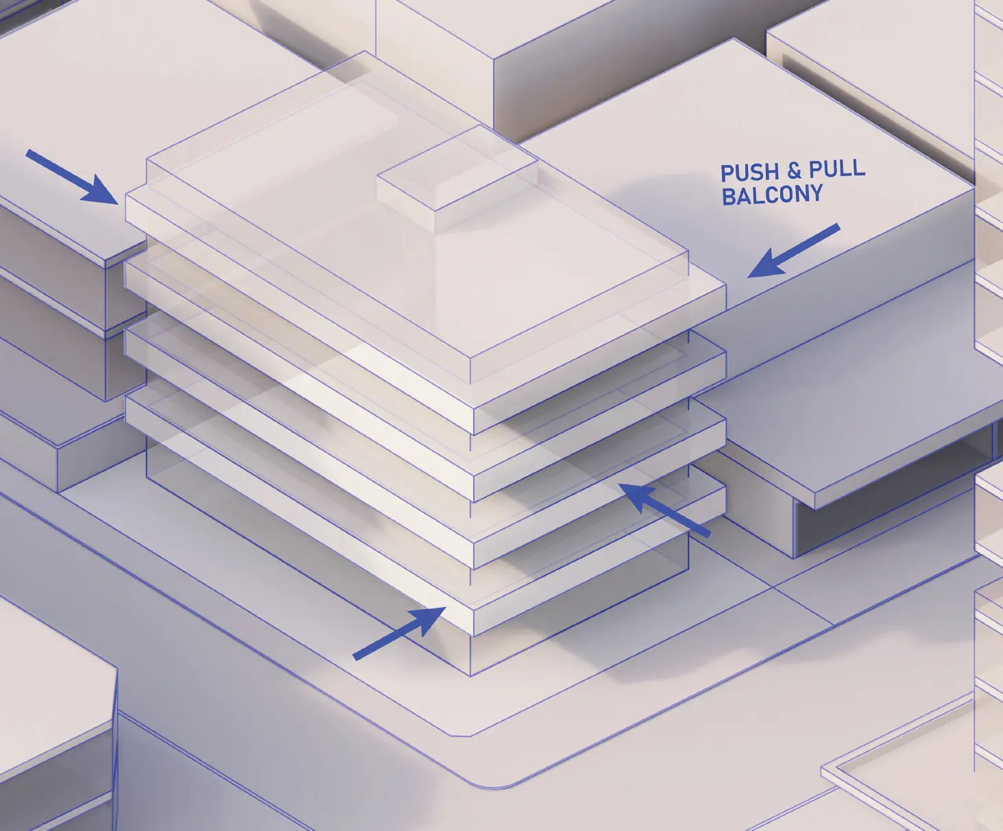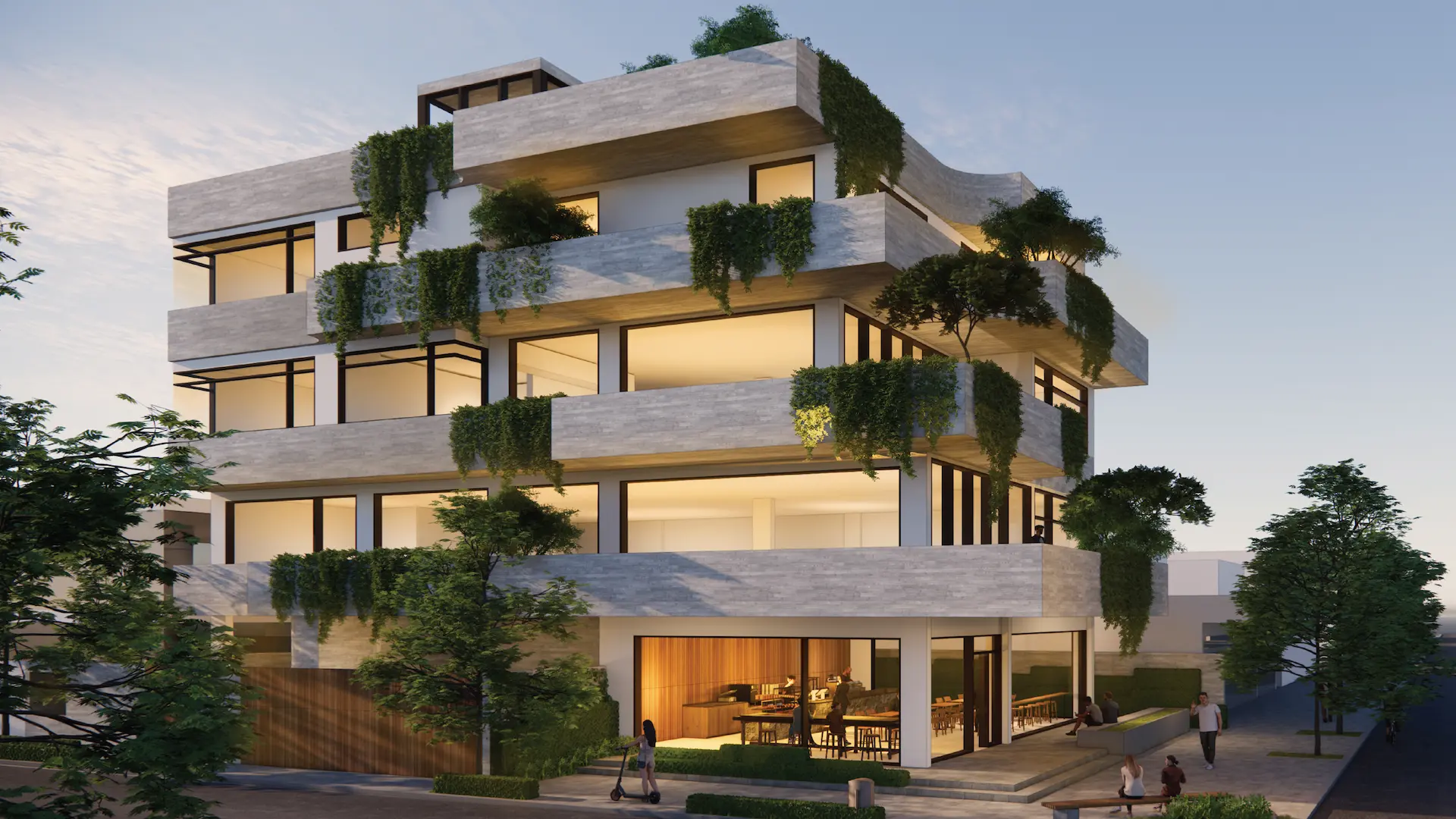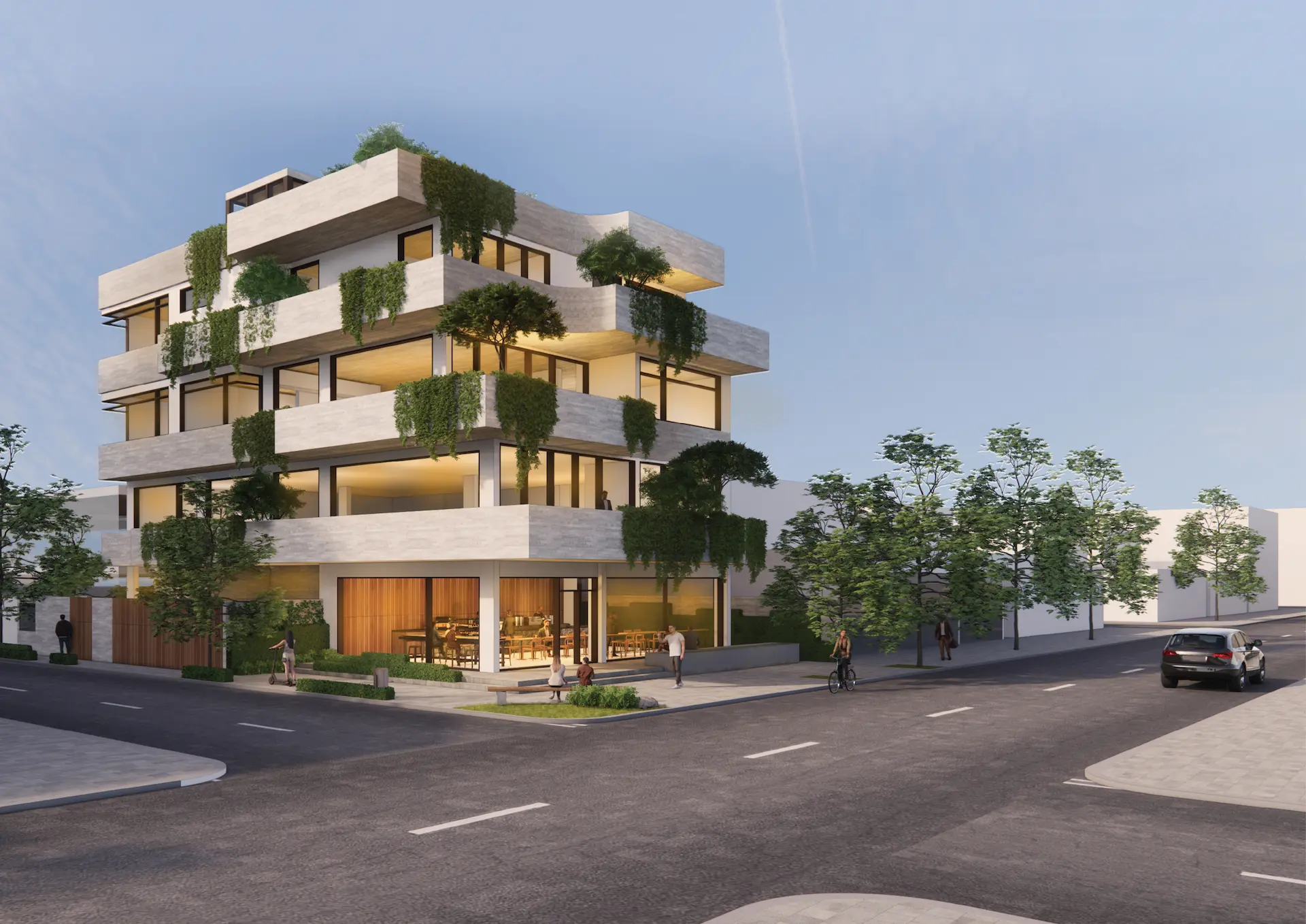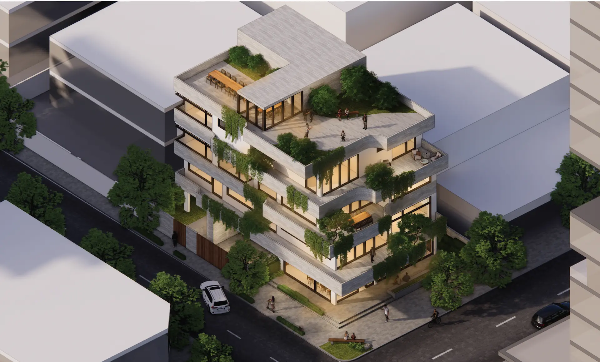 Green thresholds, filtered light, and the interplay between façade and vegetation soften the geometry of the building and provide every unit with access to open air. The architecture invites nature upward, making the building feel alive, rather than imposed.
