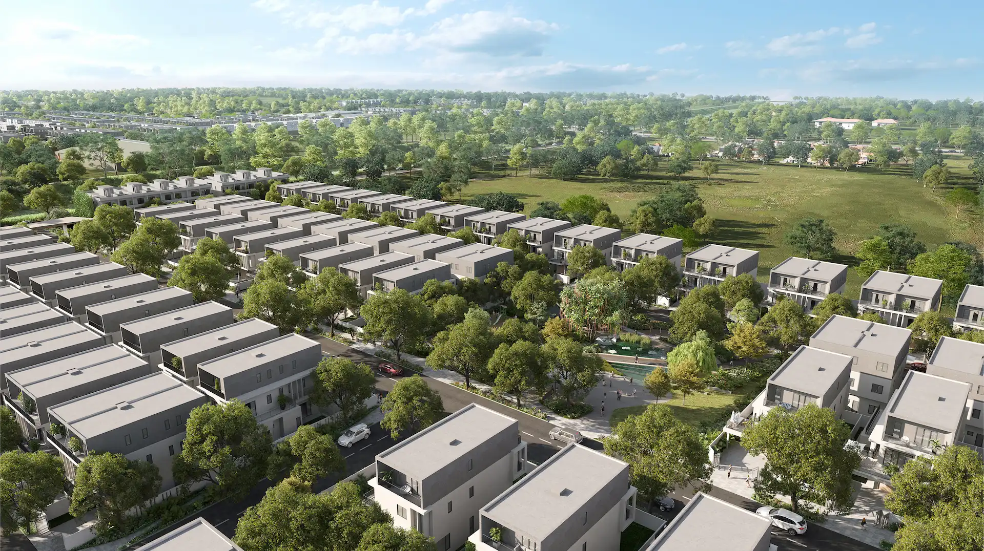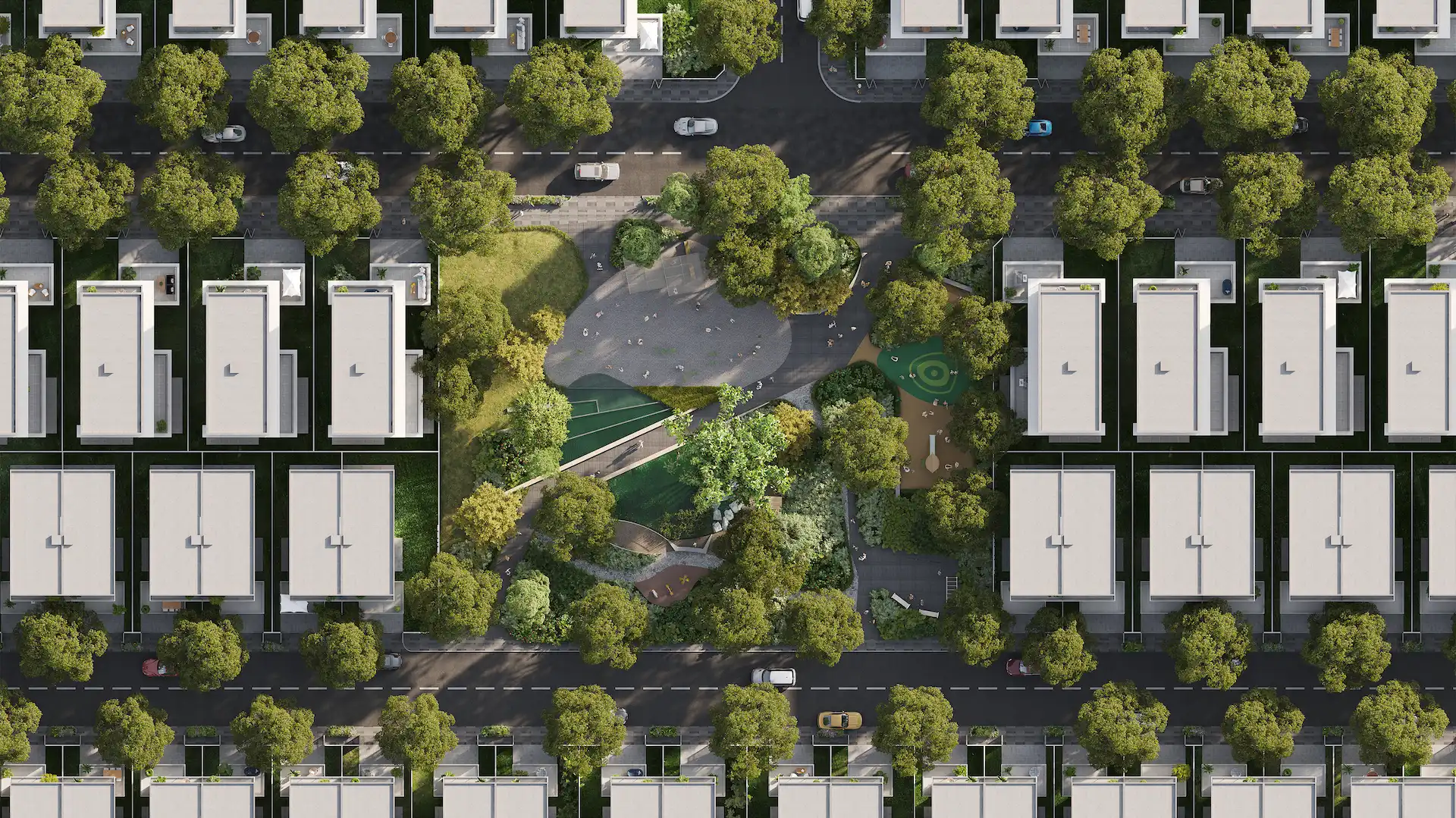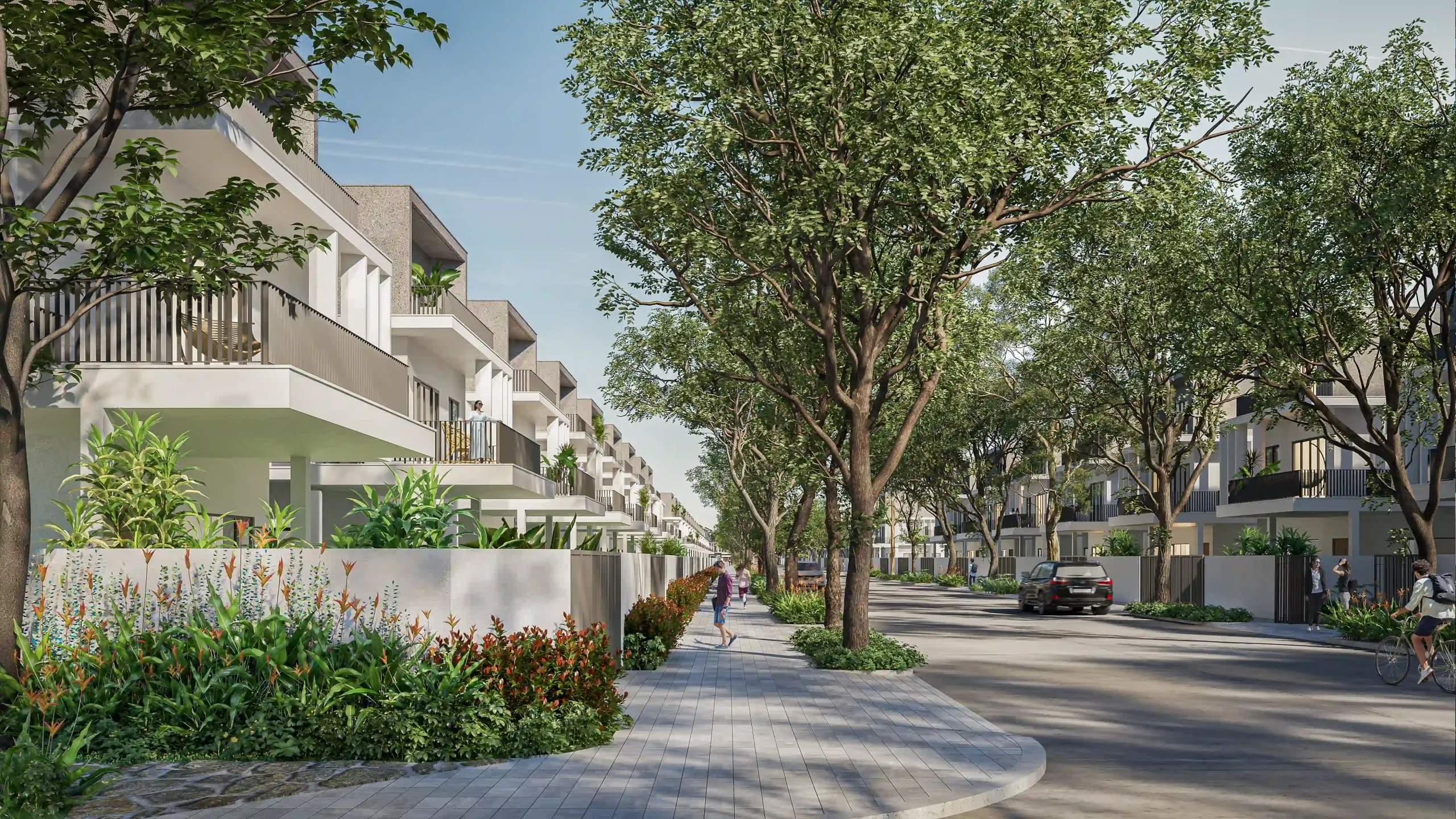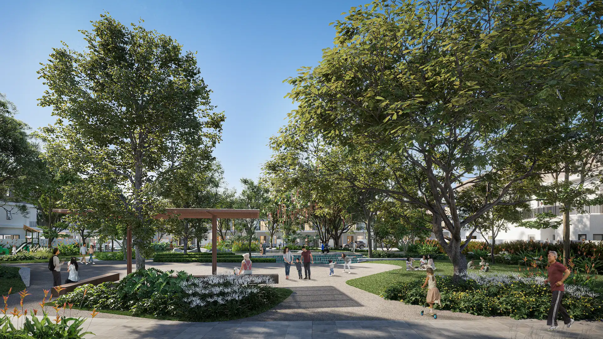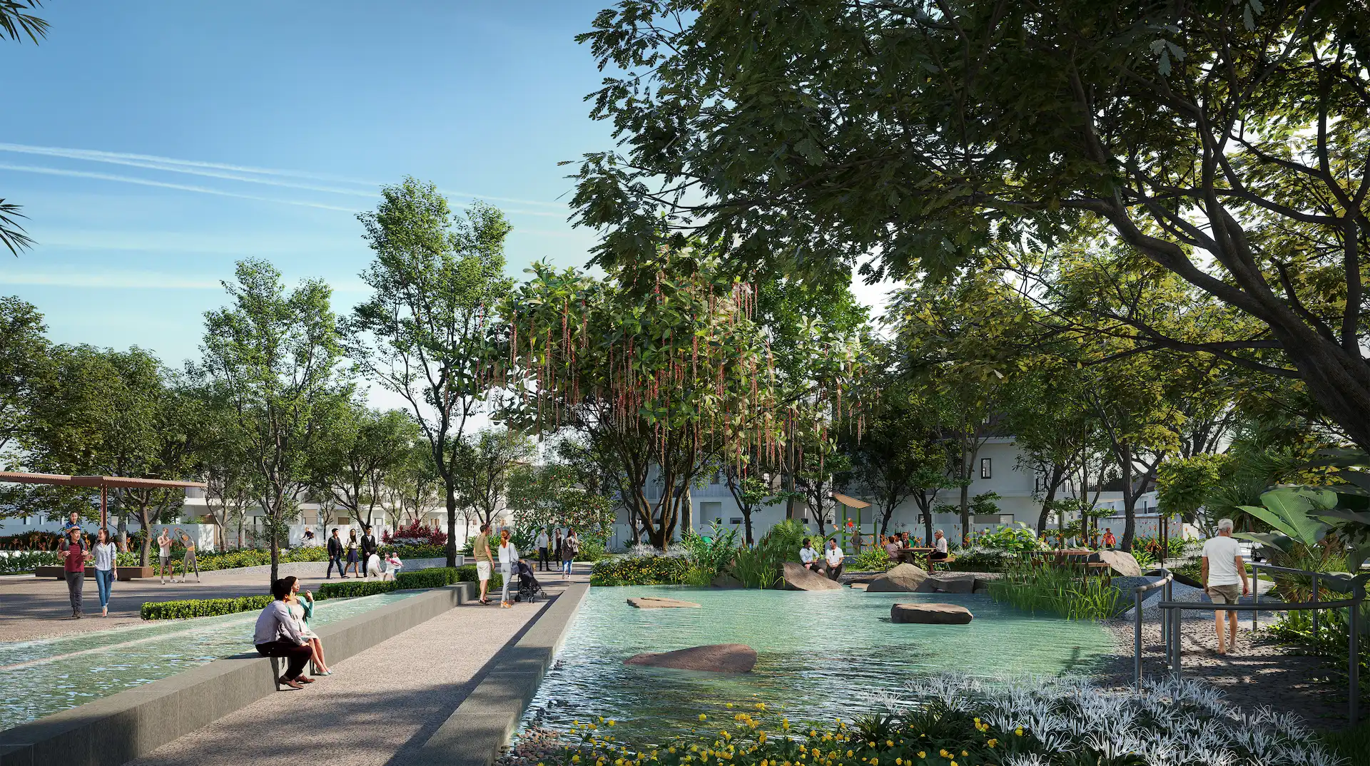 Residents are welcomed through landscaped gateways, shaded sidewalks, gathering plazas, and a creek-side park that serves as both a transition and communal heart. The design encourages movement and outdoor routines from morning walks and cycling to weekend gatherings along viewing decks overlooking the water.