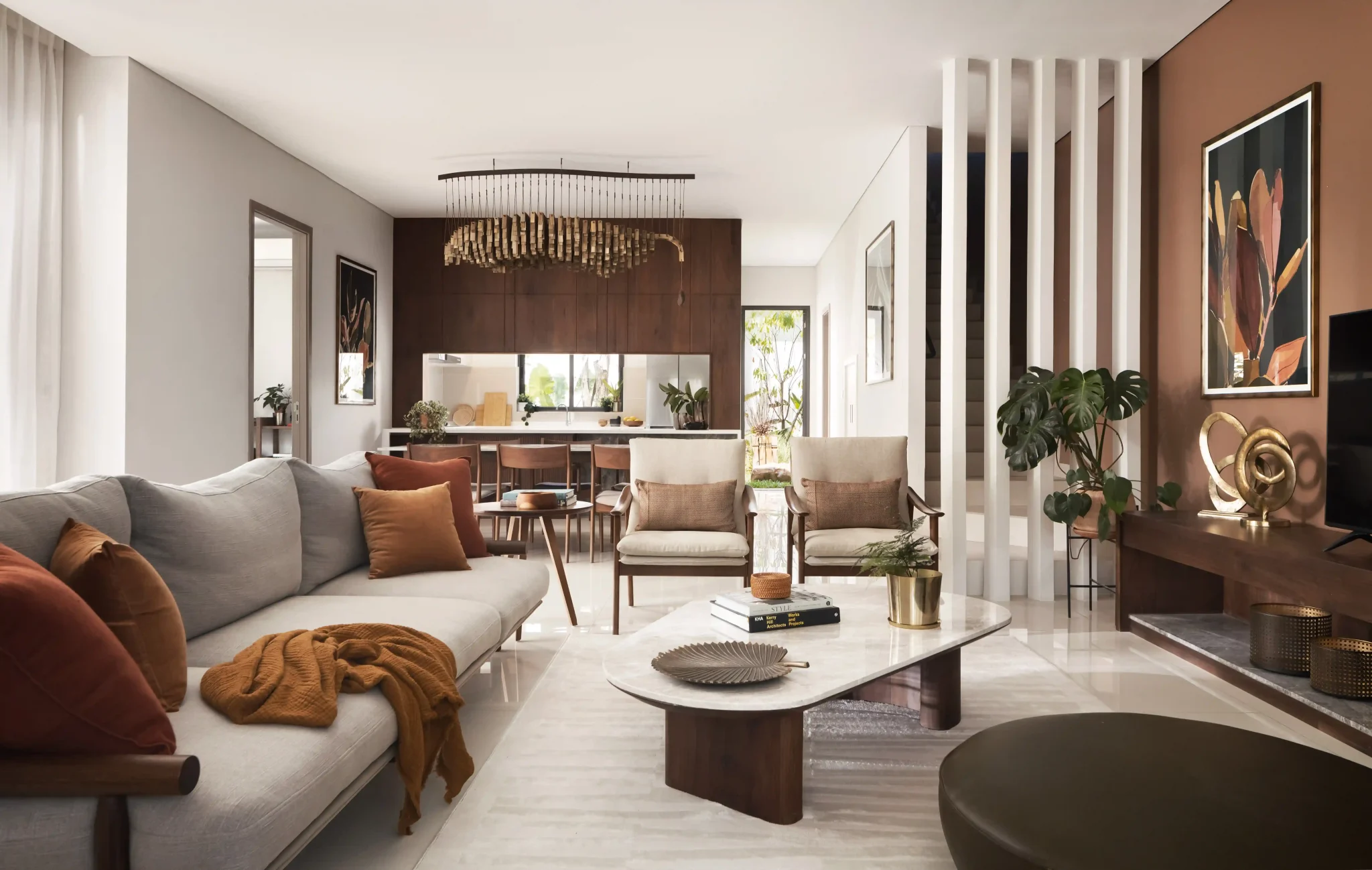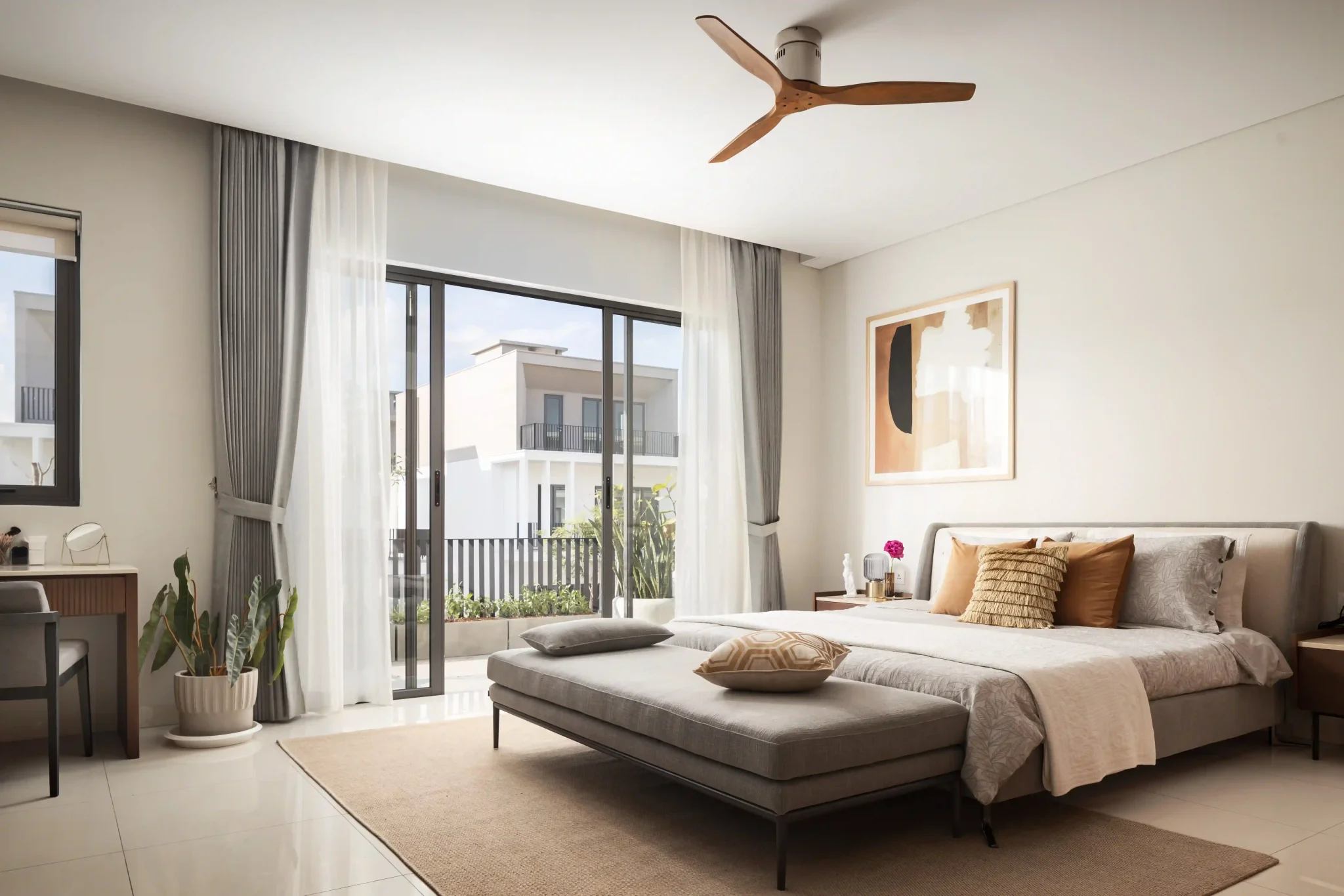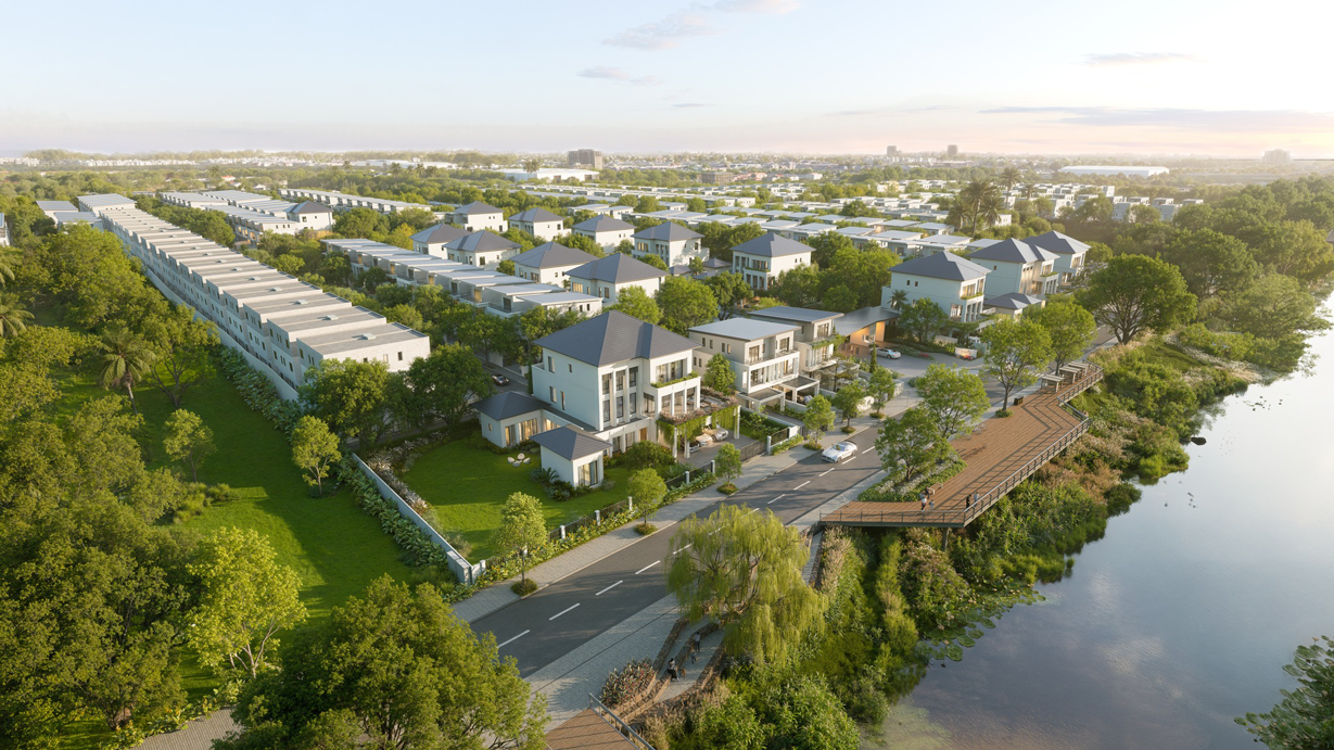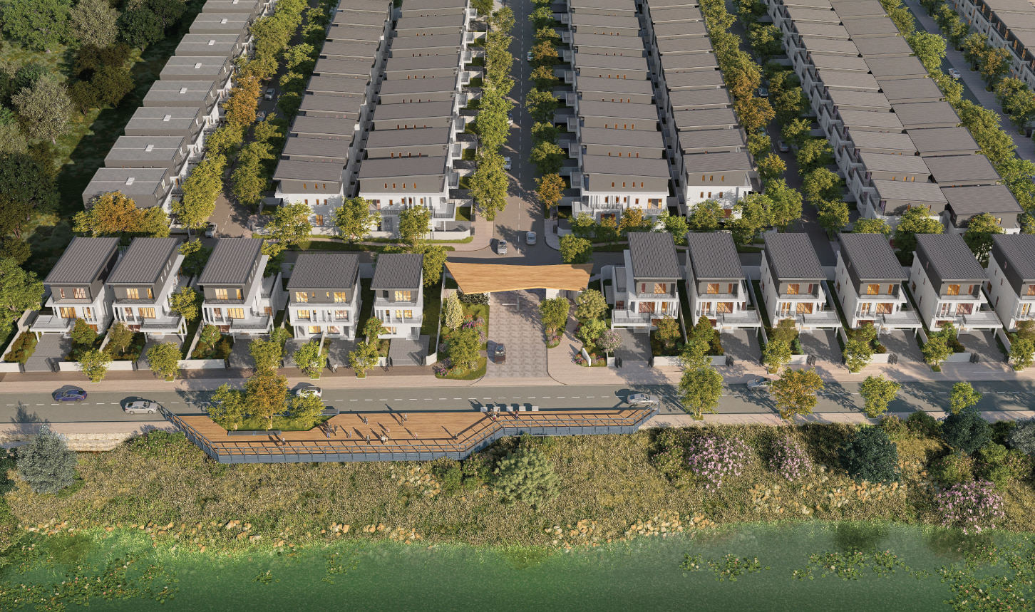 The arrival sequence begins at a tree-lined avenue leading from National Road 2, gradually distancing residents from traffic and noise. As the road approaches the water, the landscape opens and transitions into a creek-side public space with pedestrian sidewalks, seating areas and gathering spaces. This gradual transition from a bustling national road to tranquil riverside community is the first touchpoint in the Chankiri 2 experience.