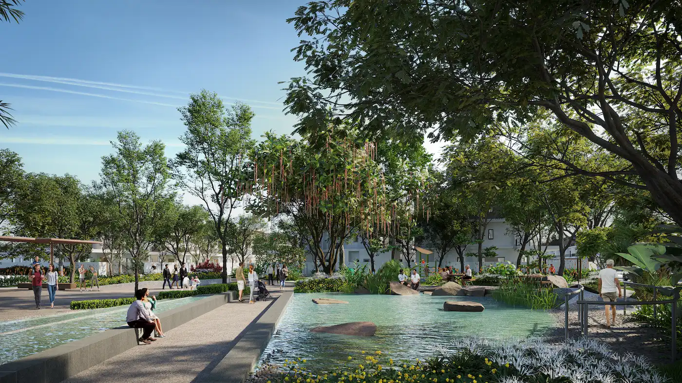 Within the project, pedestrian pathways prioritize safety and walkability, encouraging movement through parks features in the borey that eventually connect residents also to the external creekside areas and streets.