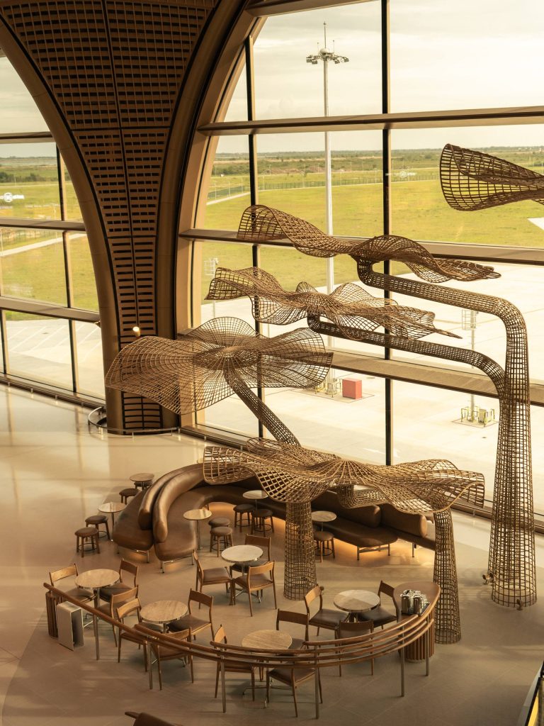 A focal point of the space is Birds Fly by Flapping Their Wings, a suspended sculpture by Artist Sopheap Pich. Crafted from bamboo, metal, and enamel, the work anchors the interior in movement and symbolism, a metaphor for travel, growth, and resilience.