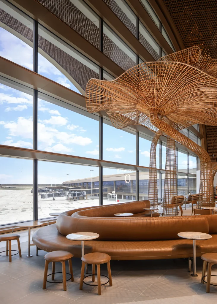 The BROWN Coffee TAI Art View, located within the main departure hall, unfolds as a quiet dialogue between architecture and art. Its calm palette of wood, rattan, and soft lighting evokes the feeling of sitting beneath leafy shade.