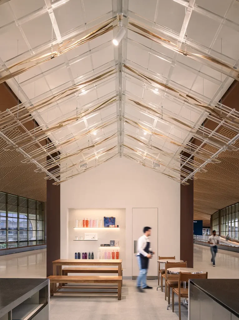 The layout opens on both sides of the walkway, creating an island of calm and connection amid the flow of travellers. The design captures the essence of From Leaf to Light, where natural materials, light, and craft merge into a timeless expression of Cambodian identity.