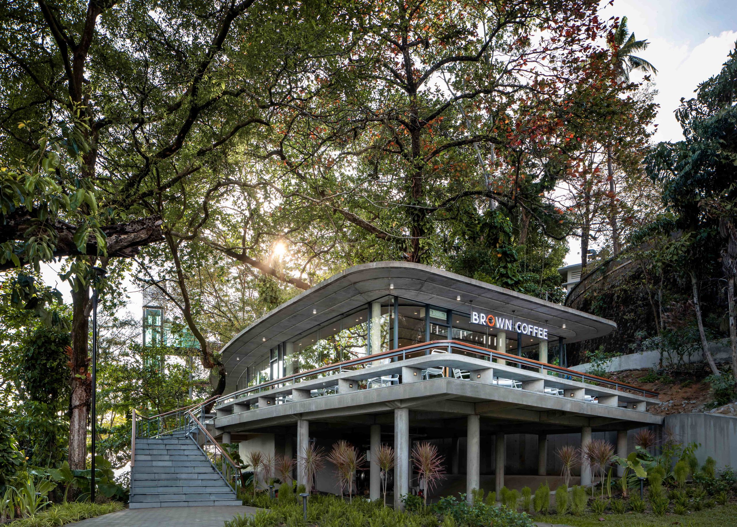 BROWN IB KPS sits on a concealed hillside near the Independence Beach Hotel, screened from the street by thick bushes and mature trees, with glimpses toward Independence Beach. The project is inspired by a careful reading of the site’s quiet narratives, bringing together sea air, hillside solidity, and lush vegetation to transform a previously unknown pocket of land into a warm place for communal gathering. Site constraints, including a nearby waste canal and a large lift structure within the sea view, were acknowledged as part of the design process and shaped the project’s response.