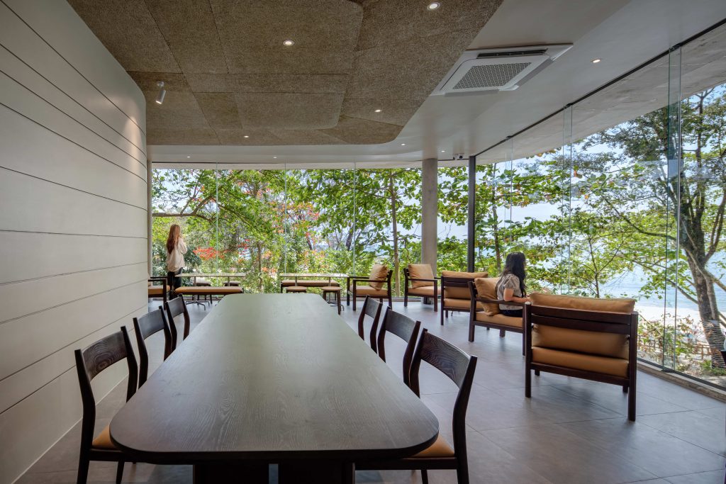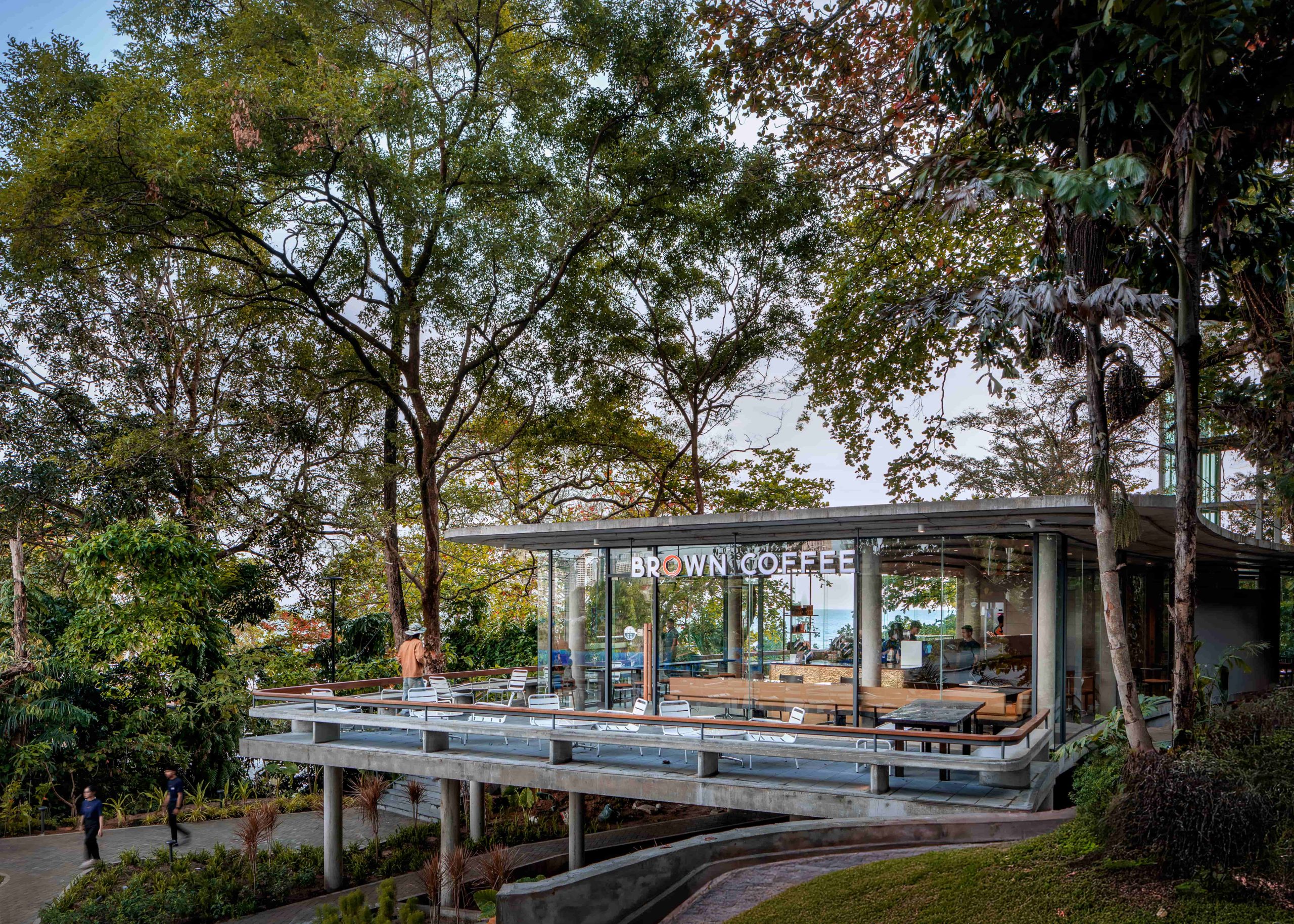 BROWN IB KPS sits on a concealed hillside near the Independence Beach Hotel, screened from the street by thick bushes and mature trees, with glimpses toward Independence Beach. The project is inspired by a careful reading of the site’s quiet narratives, bringing together sea air, hillside solidity, and lush vegetation to transform a previously unknown pocket of land into a warm place for communal gathering. Site constraints, including a nearby waste canal and a large lift structure within the sea view, were acknowledged as part of the design process and shaped the project’s response.