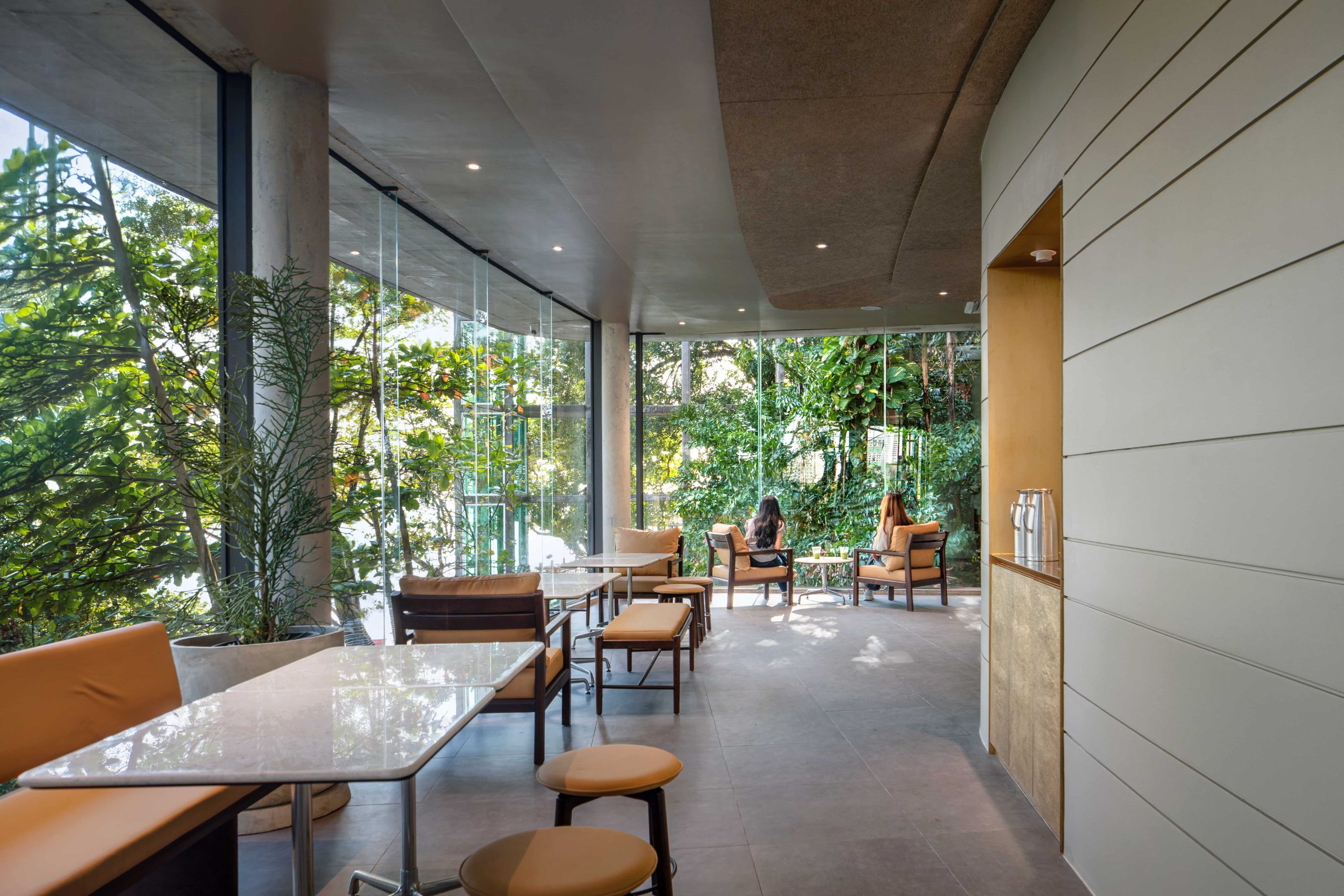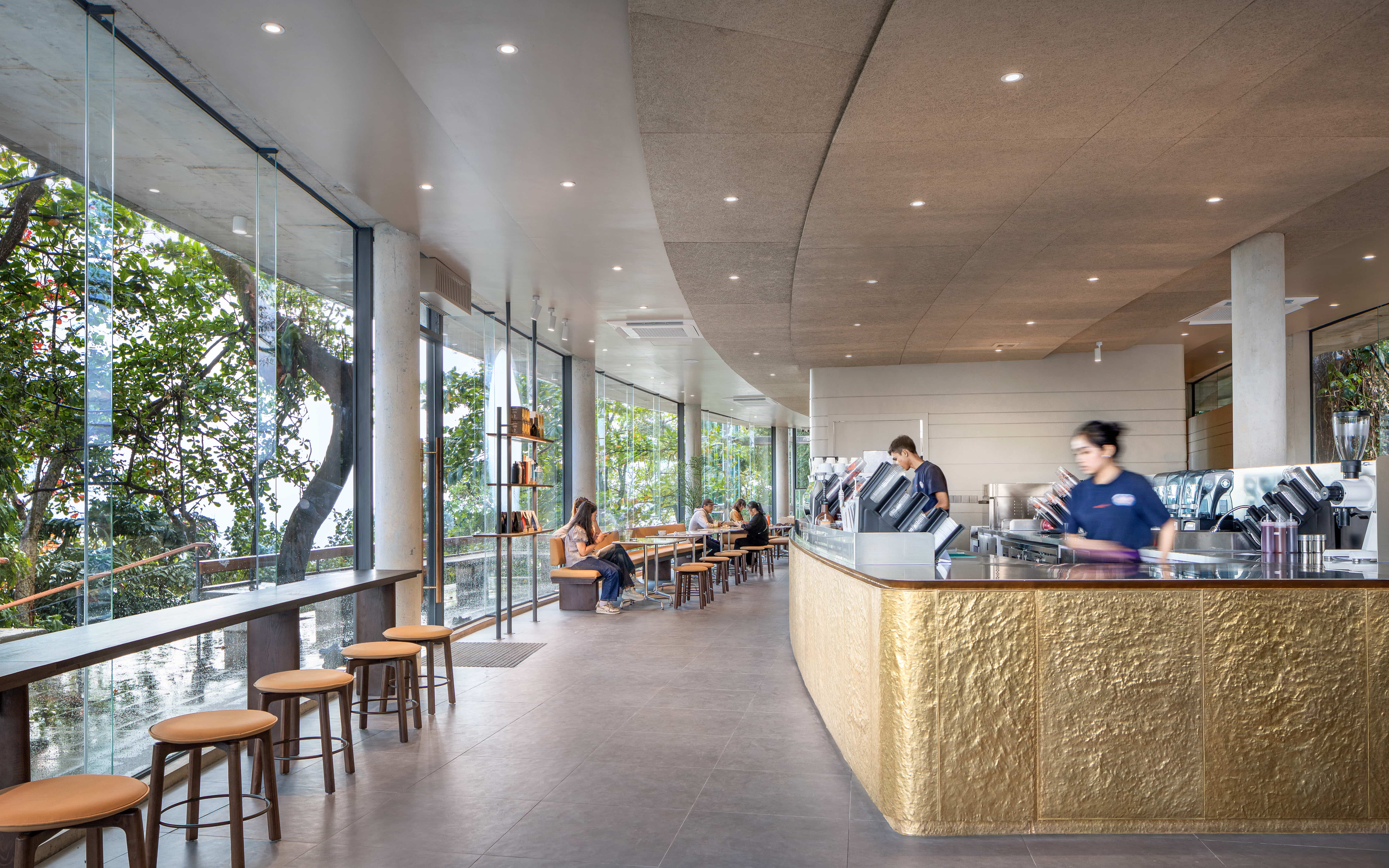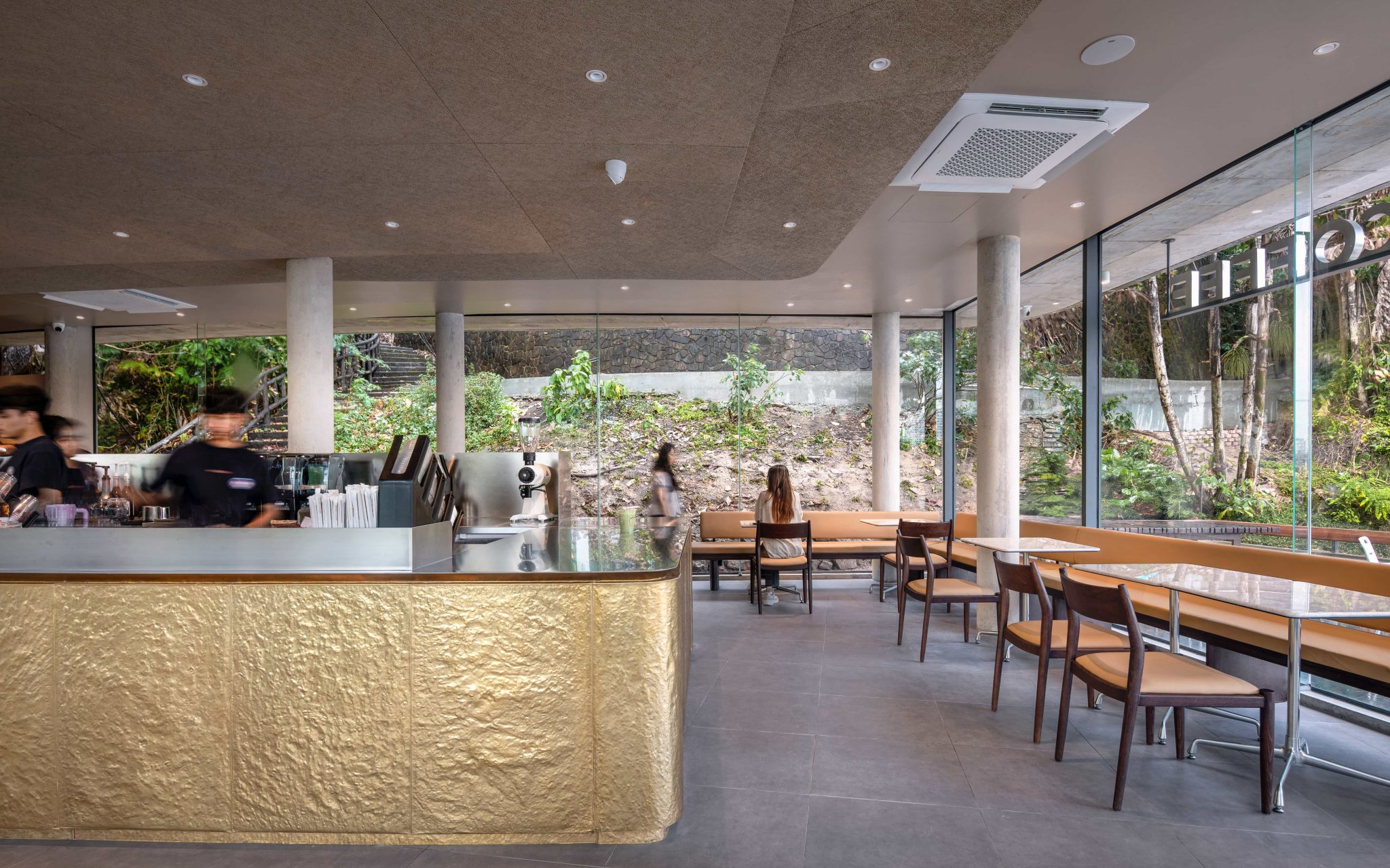 Arrival is choreographed through vegetation, where a linear concrete plane registers as a quiet emergence from the hillside. Two horizontal concrete slabs extend from the terrain, enclosed by fully transparent walls that dissolve the boundary between interior and exterior. A balcony acts as a mediating threshold between human presence and the landscape, with built-in concrete bench seating that evokes the familiarity of domestic spaces. Inside, the ceiling feature follows the hillside contour lines and gradually descends toward the counter, drawing visitors inward and enhancing intimacy. The result is a journey through space wrapped in transparency—defined by continuity, warmth, and an unfolding relationship between movement, nature, and light.