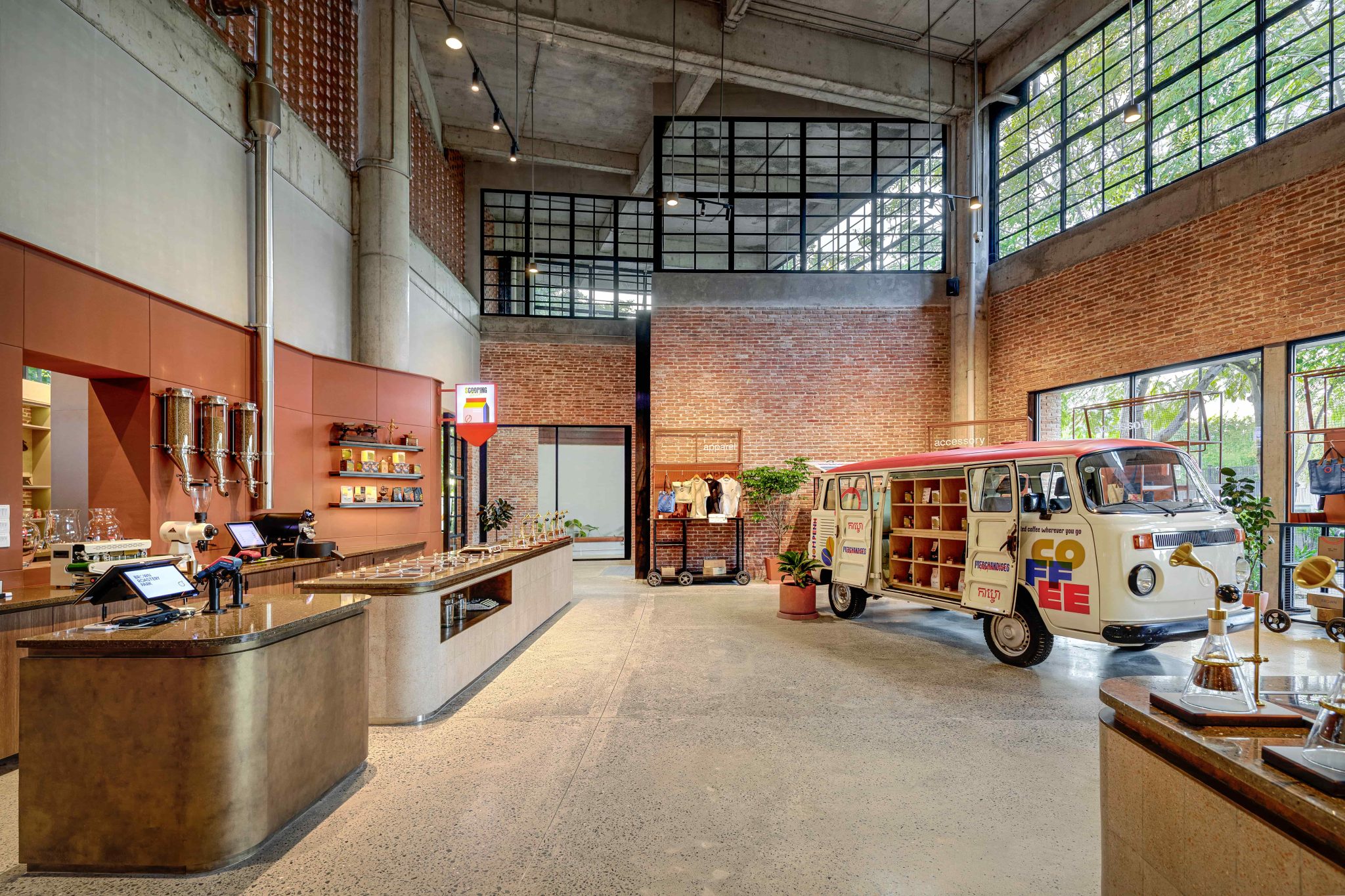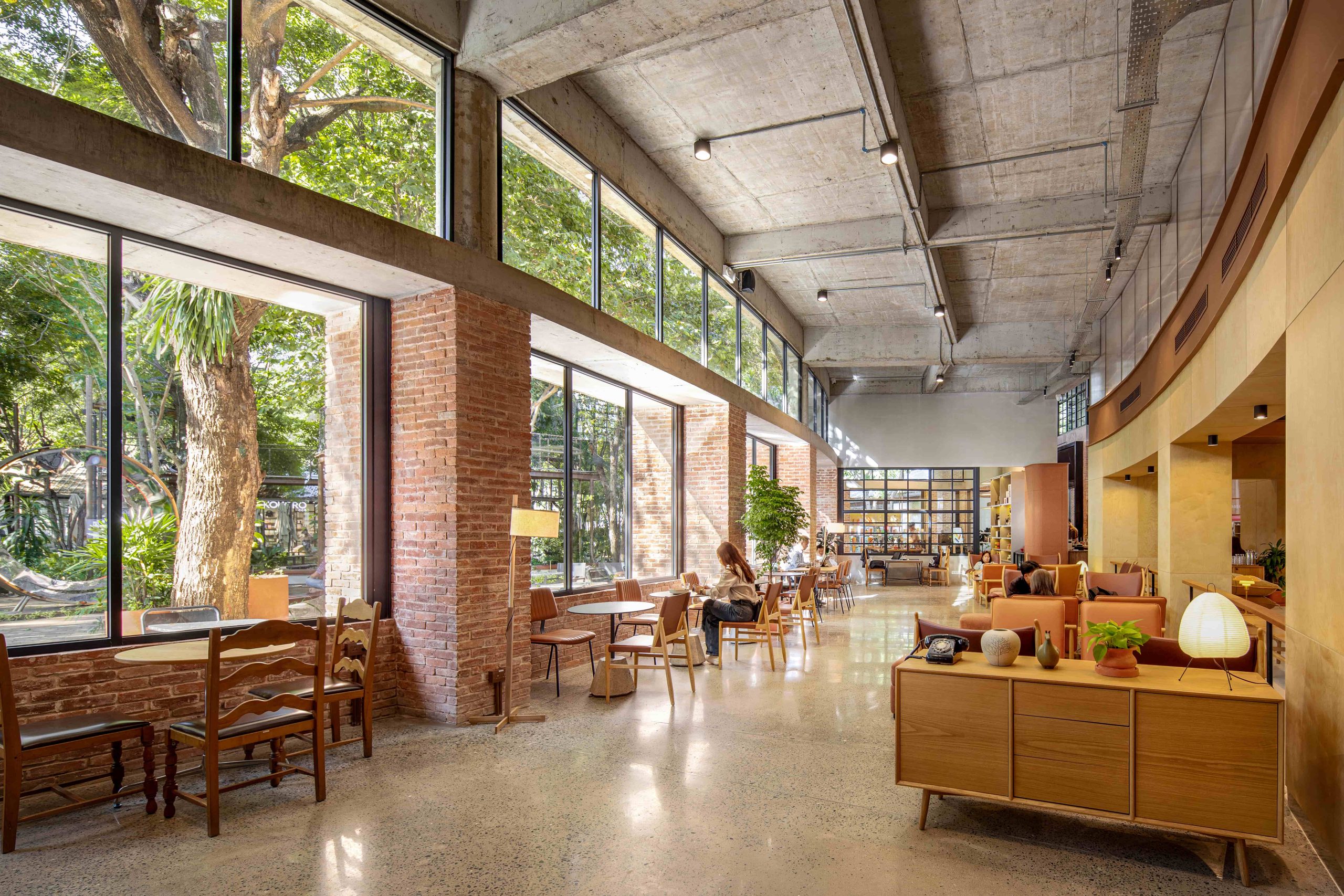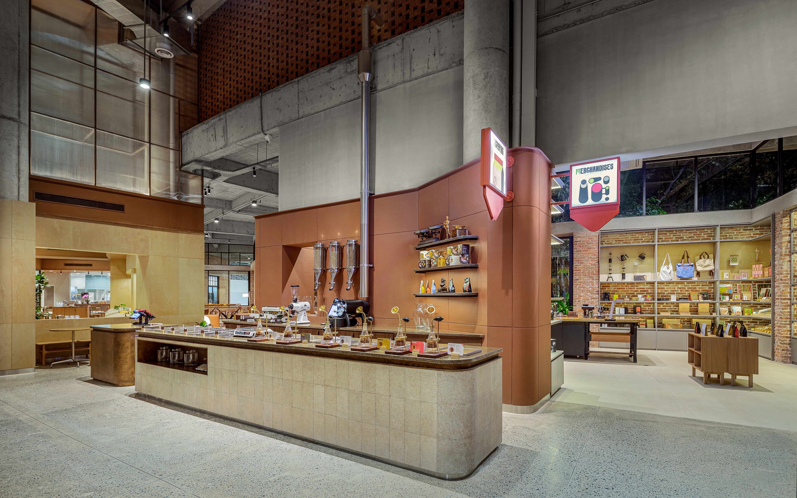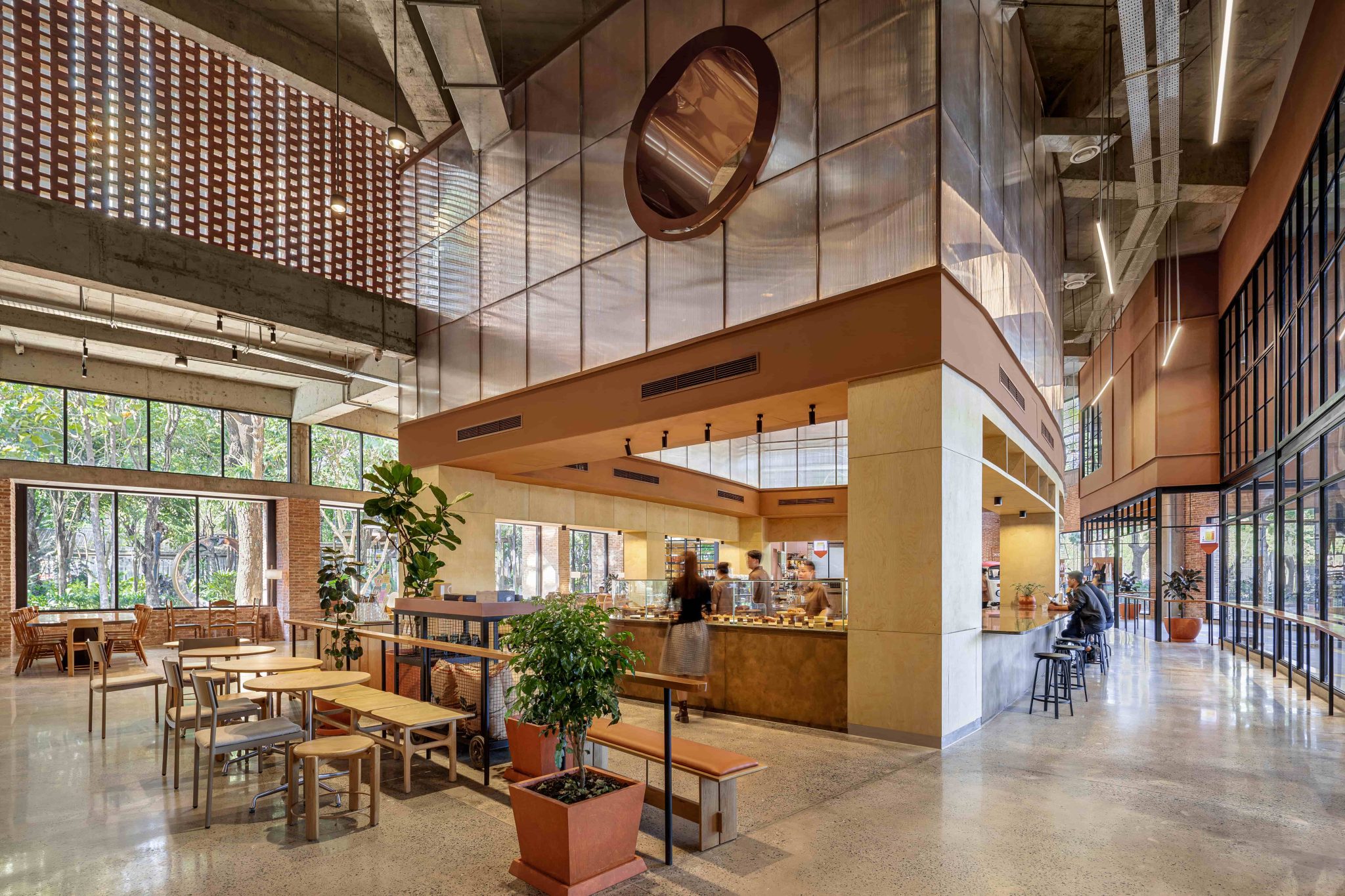 Rather than a single open hall, the space is structured into distinct zones that support different ways of using the café: focused areas for solo work, flexible group seating, and outdoor places to gather in connection with greenery. Circulation is designed to feel intuitive, allowing visitors to move naturally between quieter corners, social zones, and outdoor seating, even at peak capacity. Exclusive counters and interactive moments are integrated into the layout to create experiences unique to this flagship, while material and lighting choices reinforce warmth and human scale throughout.