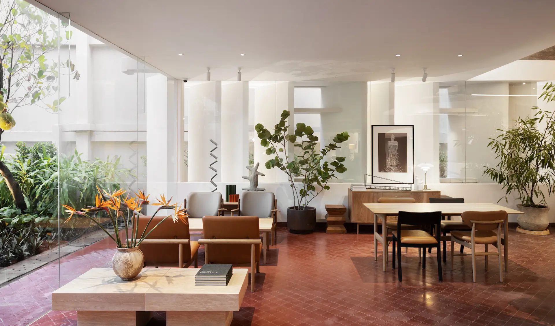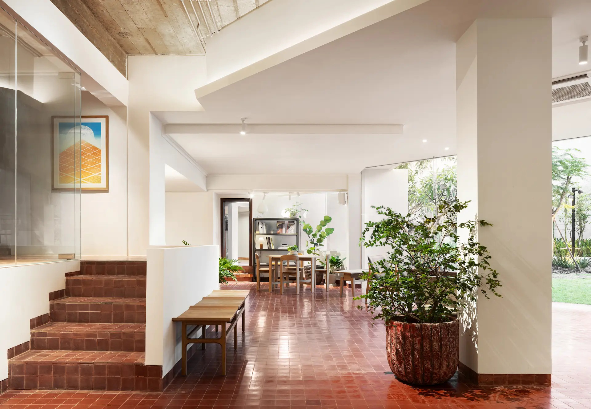 A key moment was the restoration of the brise-soleil, returning the facade to its intended proportion and expression. Inside, the staircase was brought back as a clear, sculptural centerpiece, while rooms were adapted to support a permanent archive and exhibition, meeting and research uses, and a flexible event space. The courtyard garden, previously paved over, was restored as the house’s green heart using a plant palette informed by archival reference.