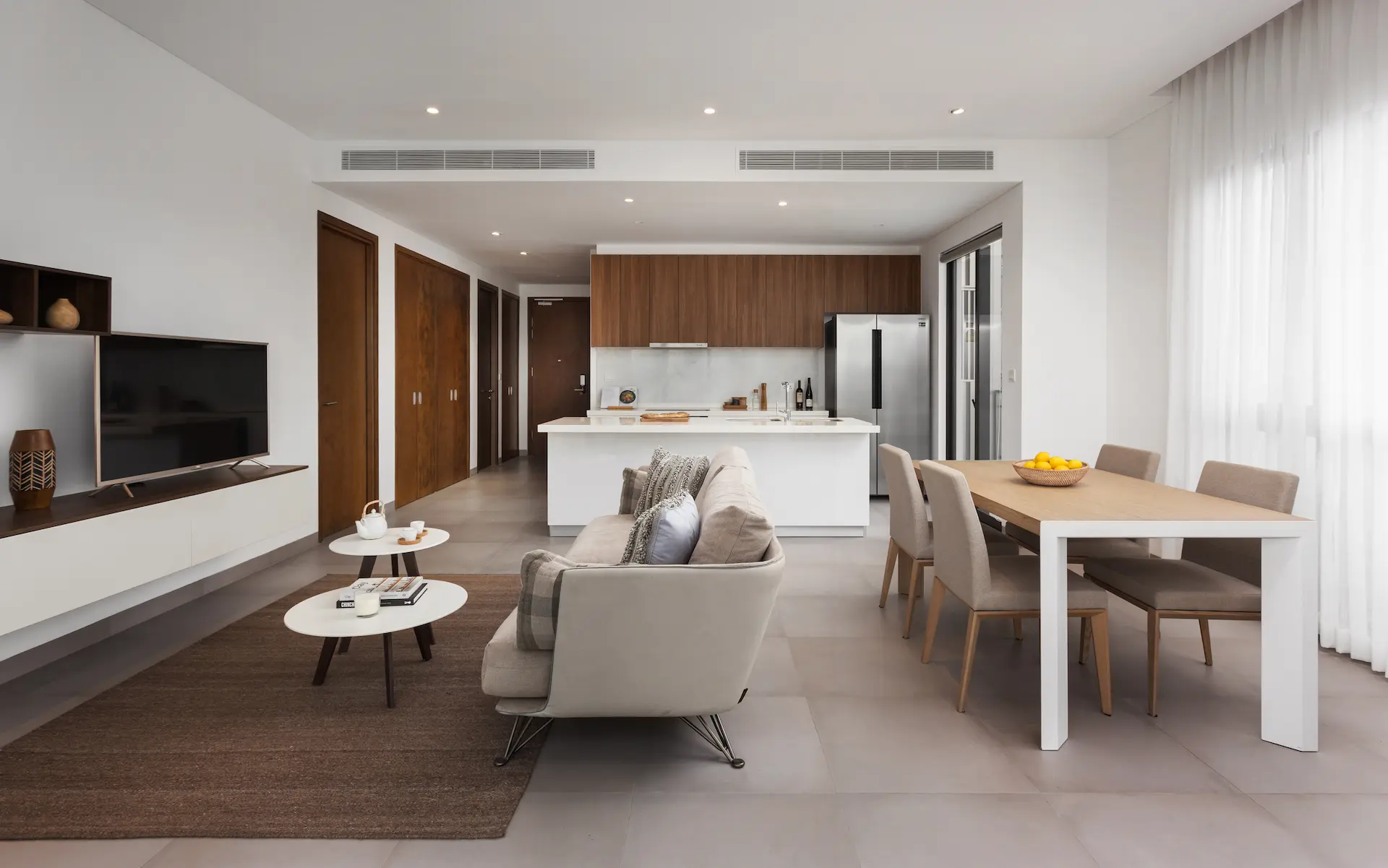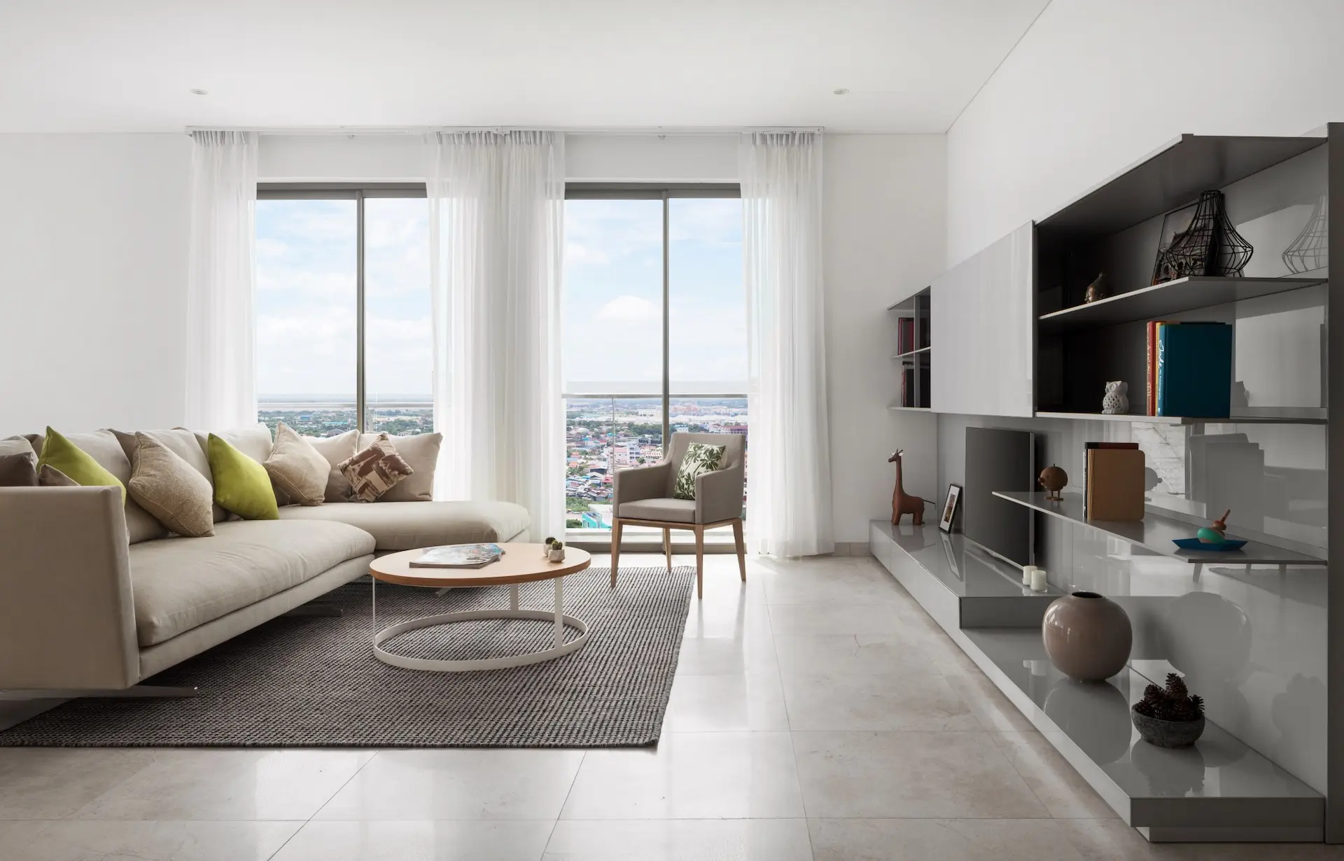 Interiors are shaped around openness and light, with large windows framing panoramic views and drawing daylight deep into the living spaces. Material choices, such as warm timber, soft textiles, and textured stone, establish an atmosphere that is comfortable and refined. Shared areas, including the lobby, lounge, pool deck, and outdoor terraces, extend the experience beyond private units and foster a sense of community.