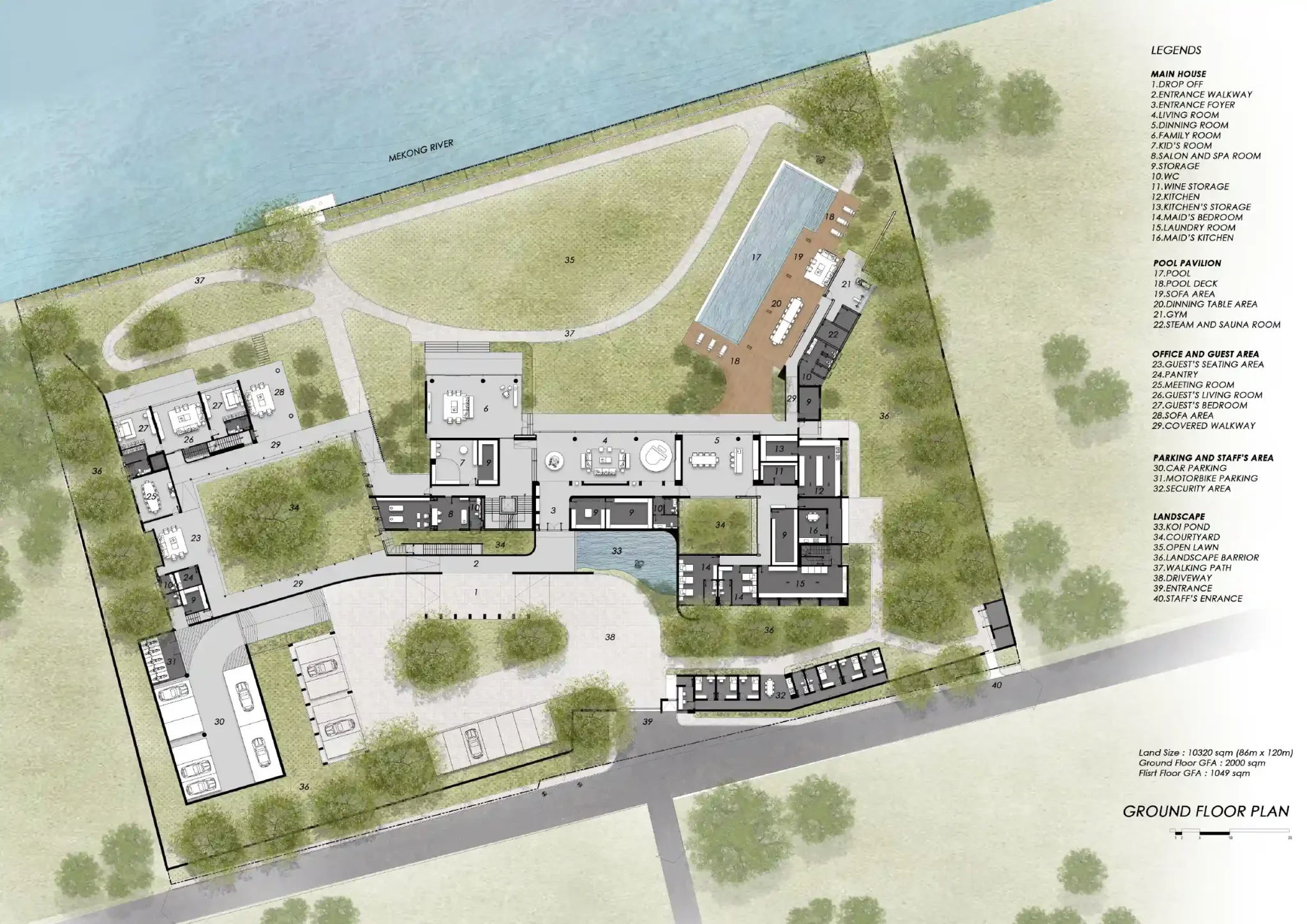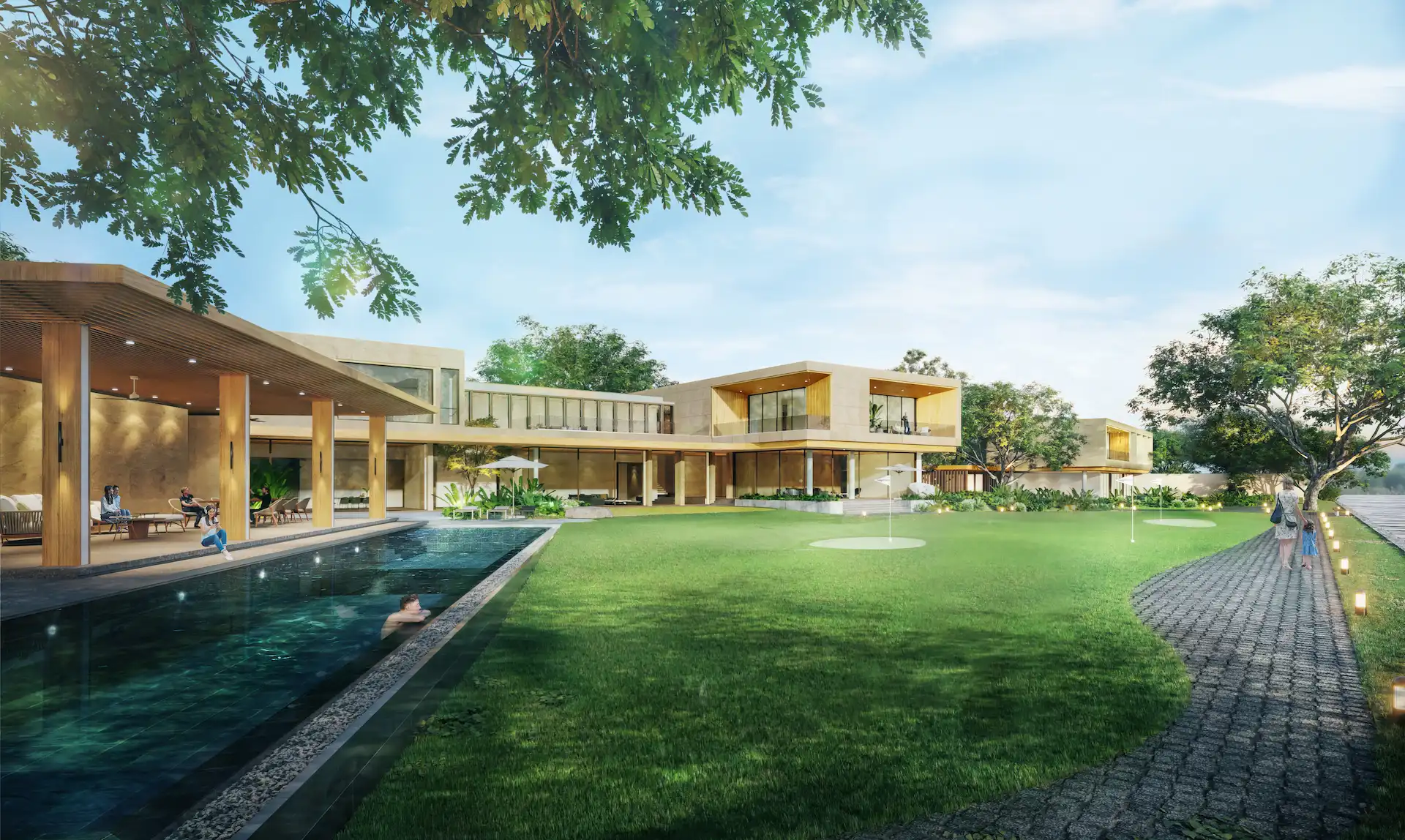 Each residential cluster is arranged to protect privacy and encourage natural ventilation, while keeping views open toward the river and the wider landscape. Terraces, semi-open shaded areas, and direct garden connections support a lifestyle that spends more time outside, without giving up comfort. The architecture is kept simple and durable, with materials and forms chosen to weather well over time and strengthen a sense of permanence and belonging.