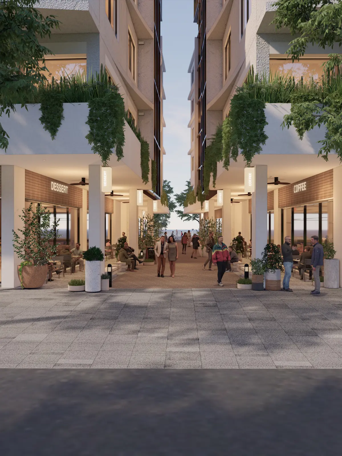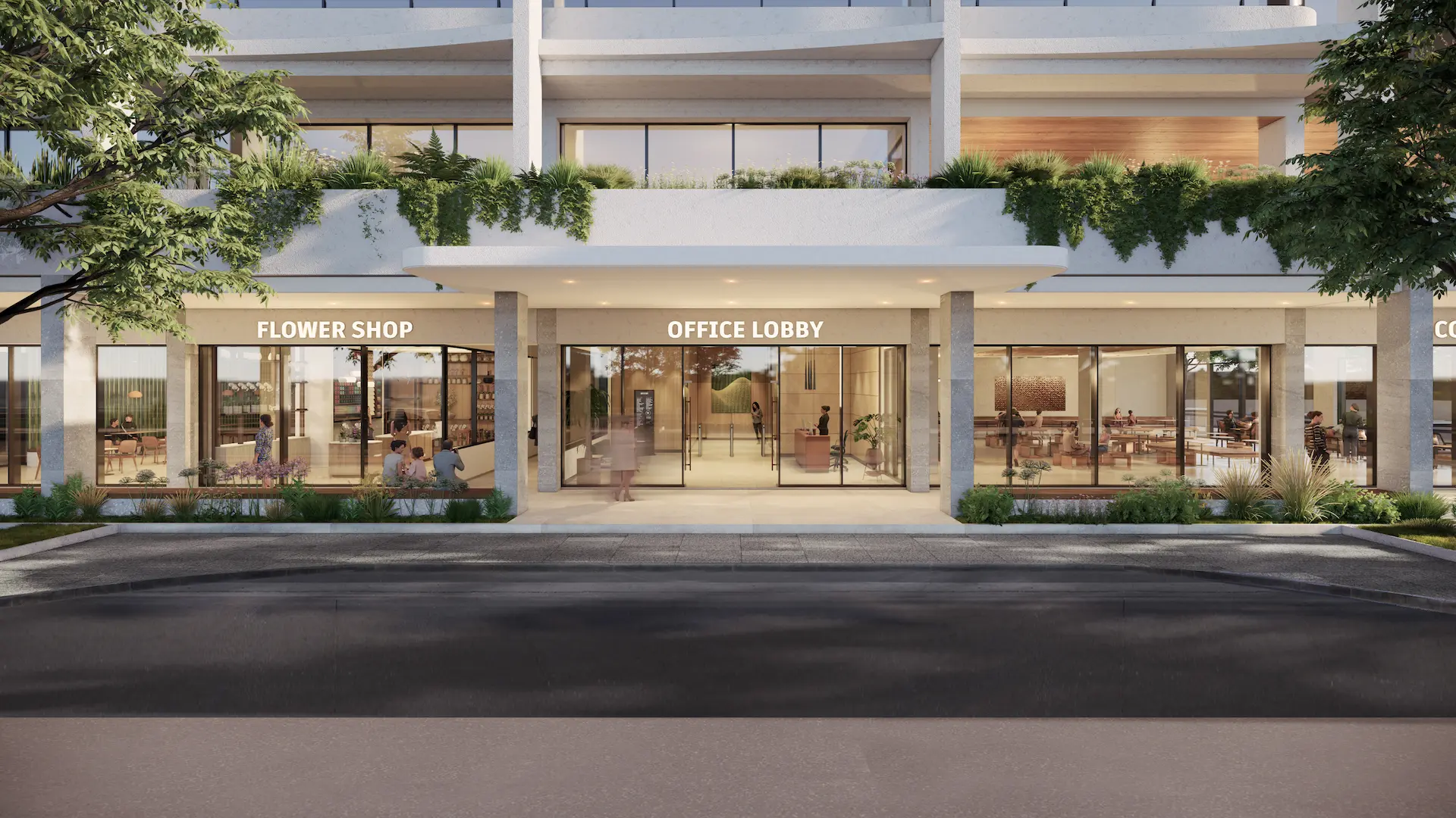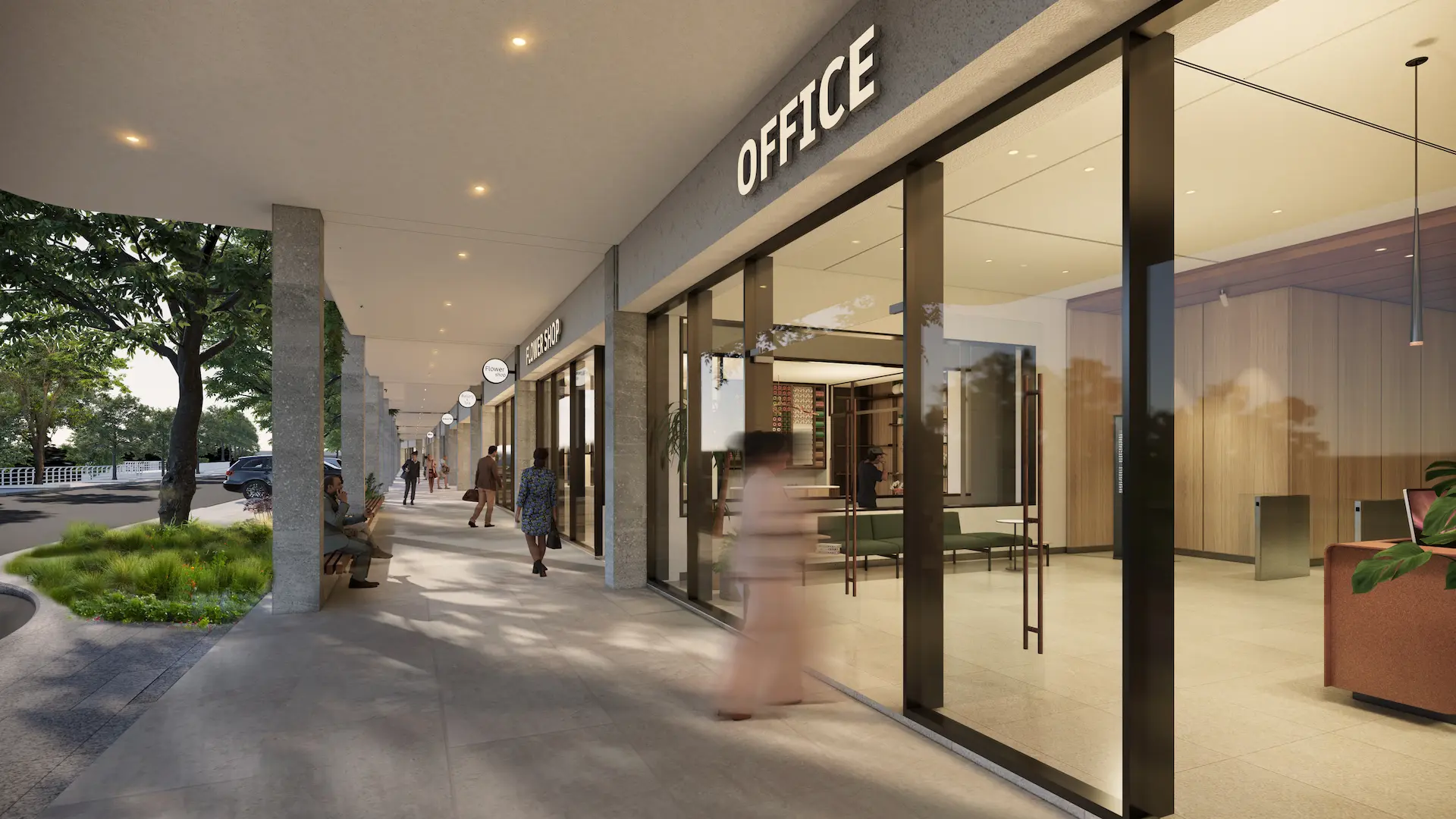 At street level, boutique retail, cafés, banking, and everyday amenities sit beneath a shaded pedestrian arcade