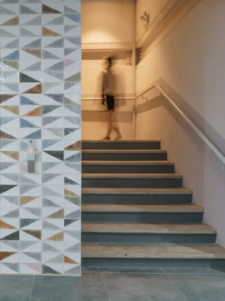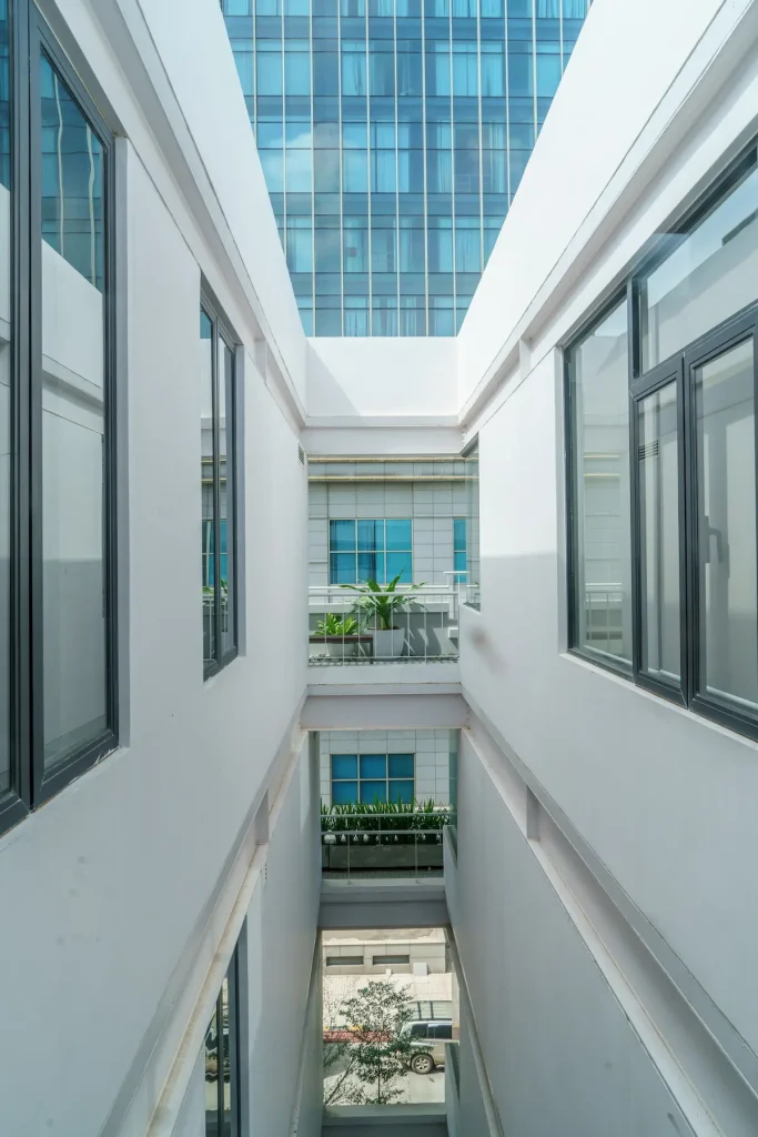 A pedestrian alley runs through the building, connecting surrounding streets and creating a vibrant corridor reminiscent of Phnom Penh’s lunch alleys. This encourages pop-up vendors, spontaneous activities and a sense of community that extends beyond the office tenants.