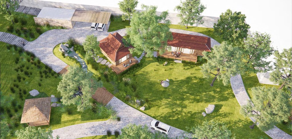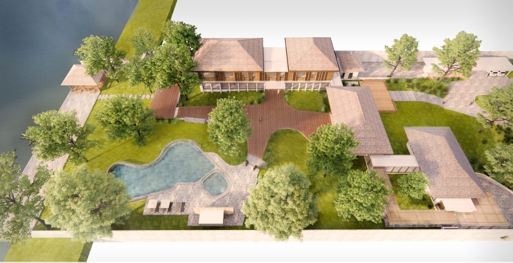 Soursdey Residence is envisioned as a peaceful riverside retreat that balances architecture, landscape, and lifestyle. The masterplan stretches from the riverfront to the main road, creating a clear sequence from arrival to private living. A defined arrival court at the entrance provides a welcoming transition into the landscaped setting, gradually revealing the river beyond.