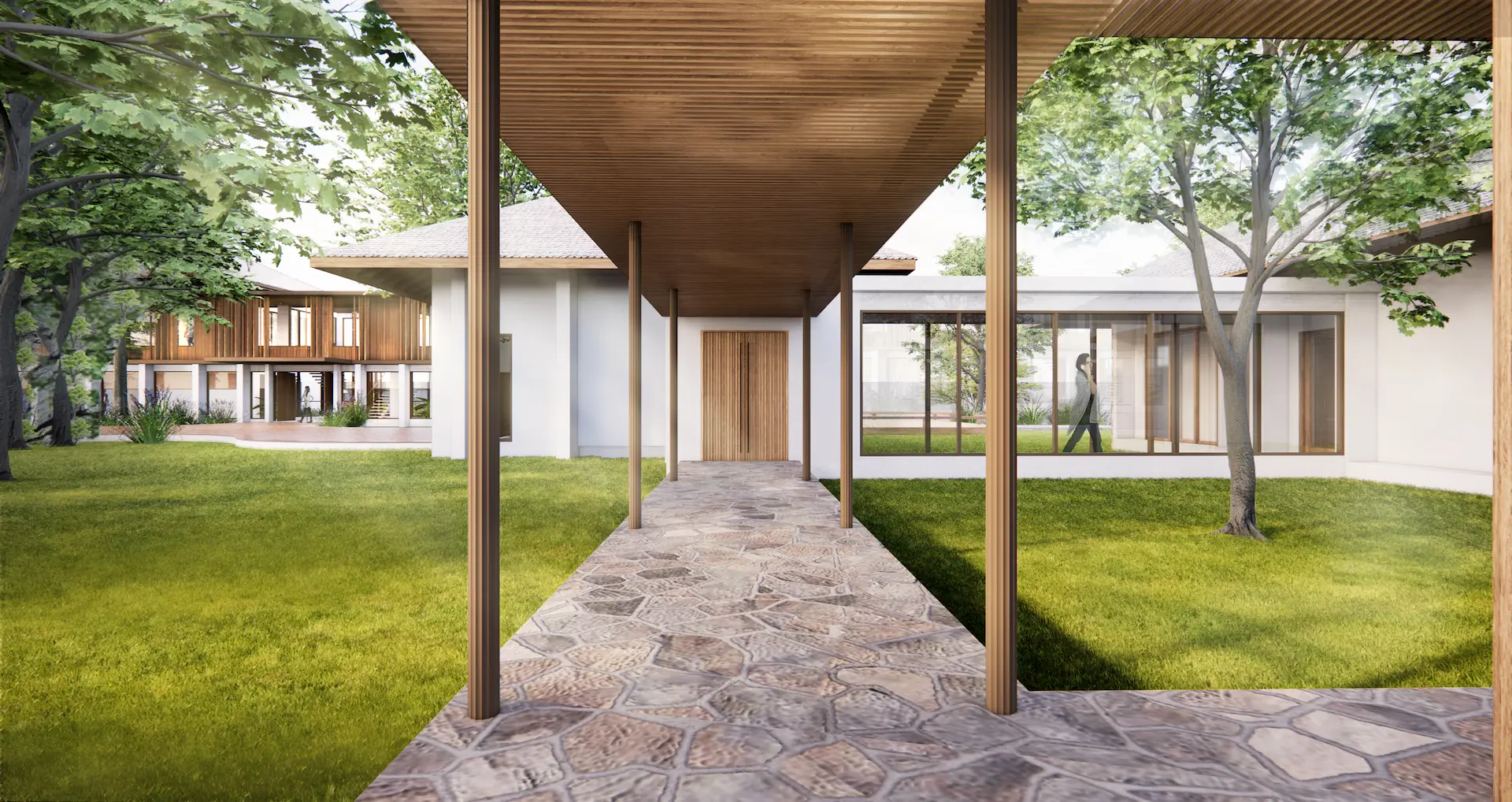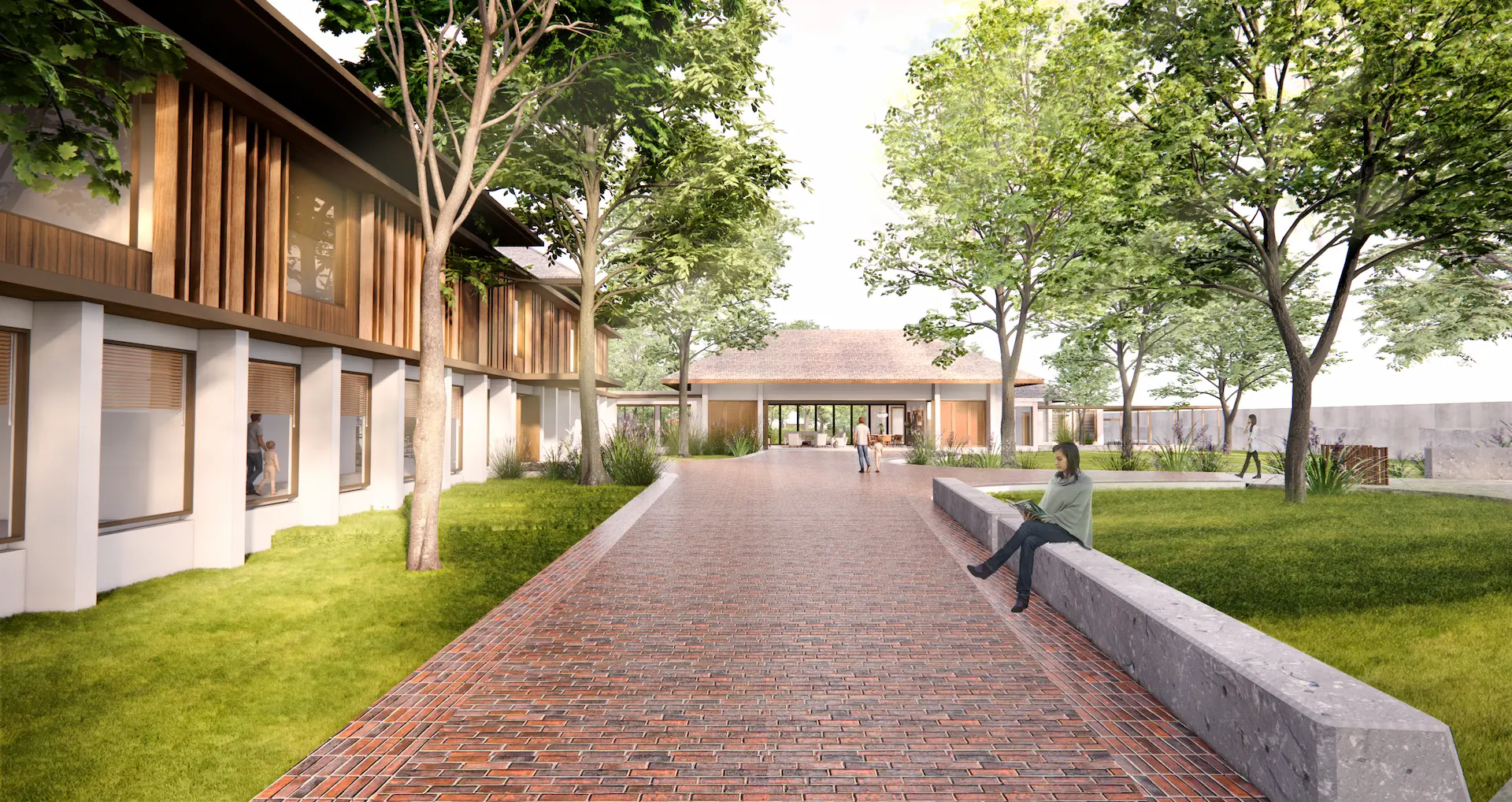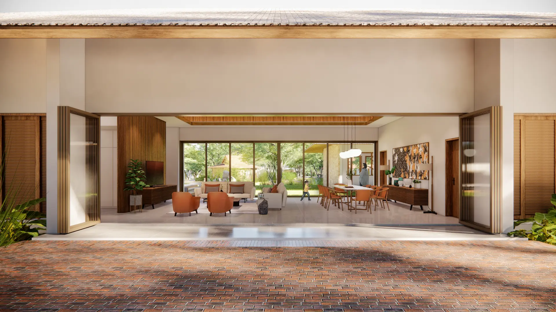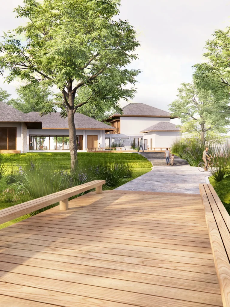 The main house is approached by a warm-toned brick pathway that leads through a green courtyard lined with mature trees. Clean modern lines are softened by natural materials, with wood to the upper façade and large glazing to bring daylight and garden views inside. An open plan supports easy indoor–outdoor living, while the subtly sloped roof and natural finishes reinforce a calm, grounded atmosphere. At the back, a layered riverside setting—courtyard, pool, and pavilion—creates space for family life, gatherings, and quiet rest, open to breezes and framed by greenery.