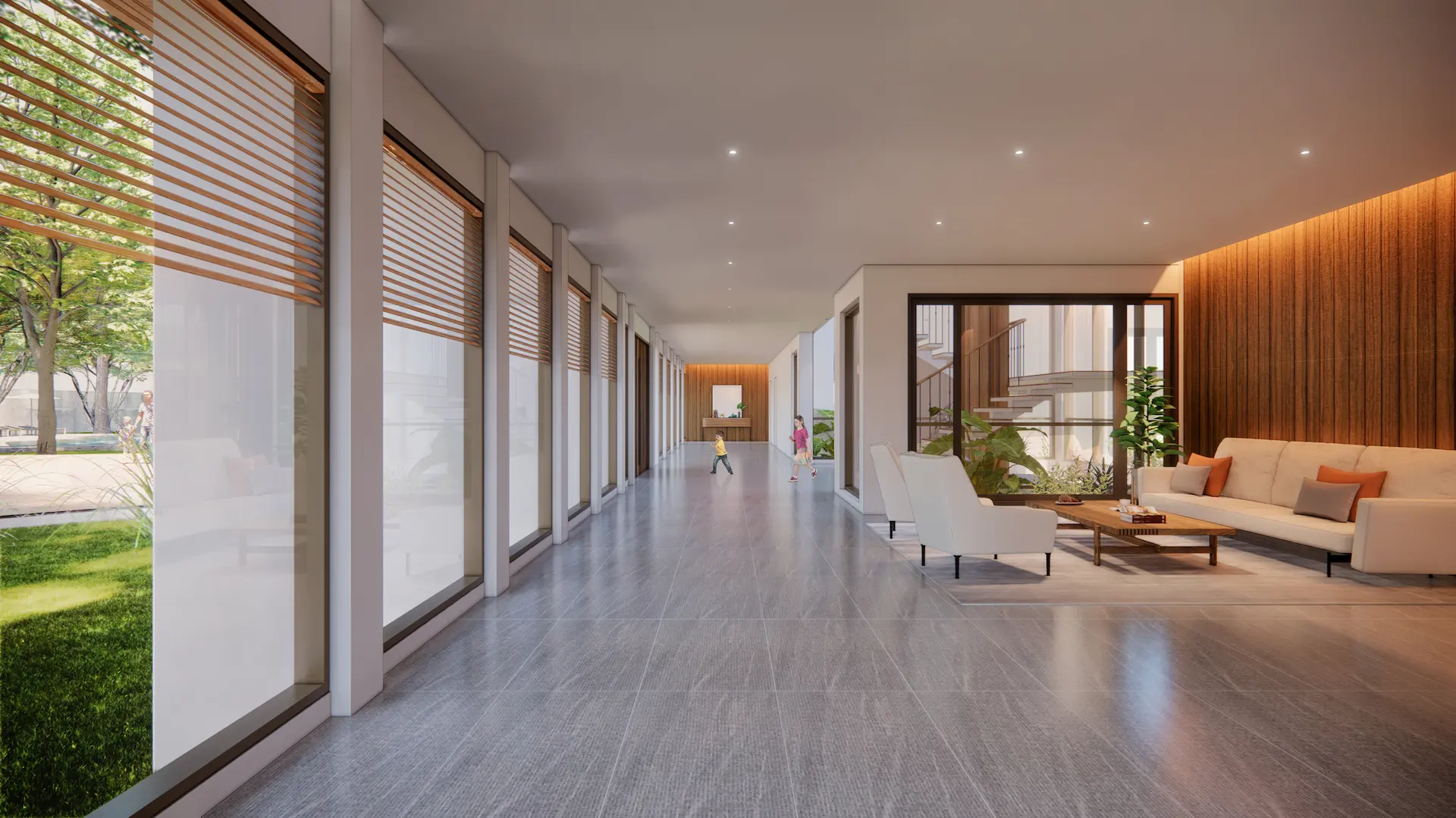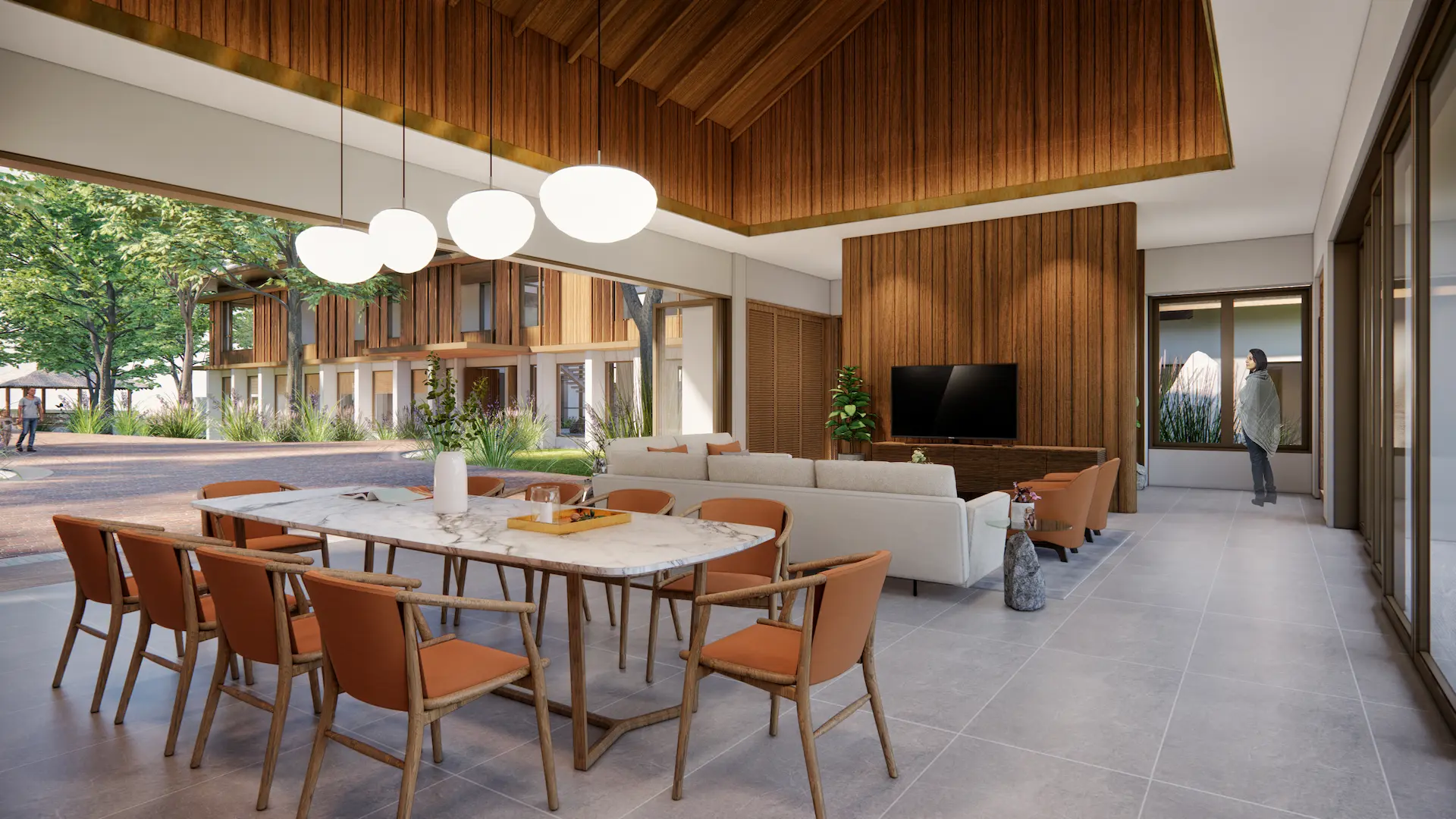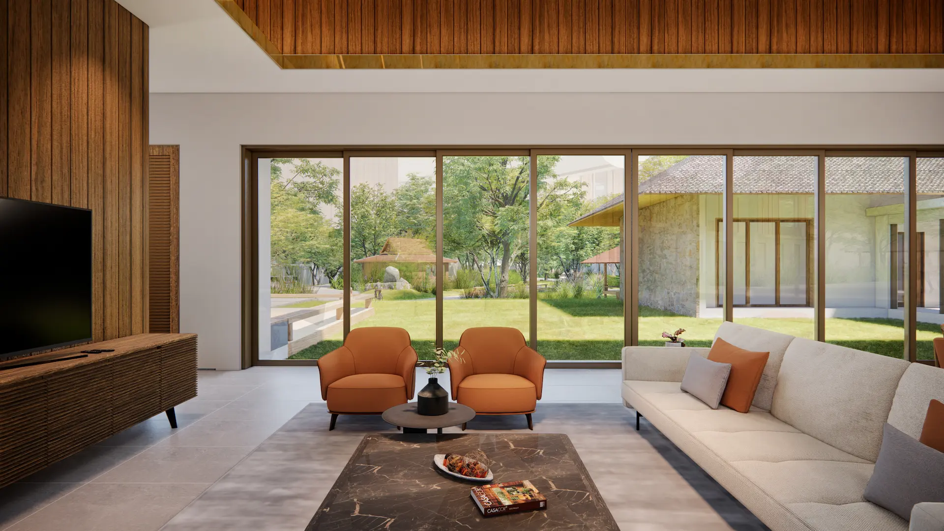 The main house is approached by a warm-toned brick pathway that leads through a green courtyard lined with mature trees. Clean modern lines are softened by natural materials, with wood to the upper façade and large glazing to bring daylight and garden views inside. An open plan supports easy indoor–outdoor living, while the subtly sloped roof and natural finishes reinforce a calm, grounded atmosphere. At the back, a layered riverside setting—courtyard, pool, and pavilion—creates space for family life, gatherings, and quiet rest, open to breezes and framed by greenery.