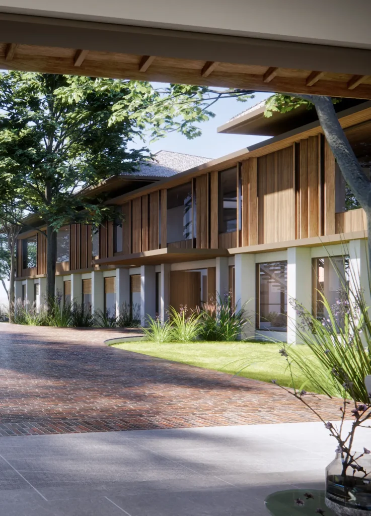 Soursdey Residence is envisioned as a peaceful riverside retreat that balances architecture, landscape, and lifestyle. The masterplan stretches from the riverfront to the main road, creating a clear sequence from arrival to private living. A defined arrival court at the entrance provides a welcoming transition into the landscaped setting, gradually revealing the river beyond.
