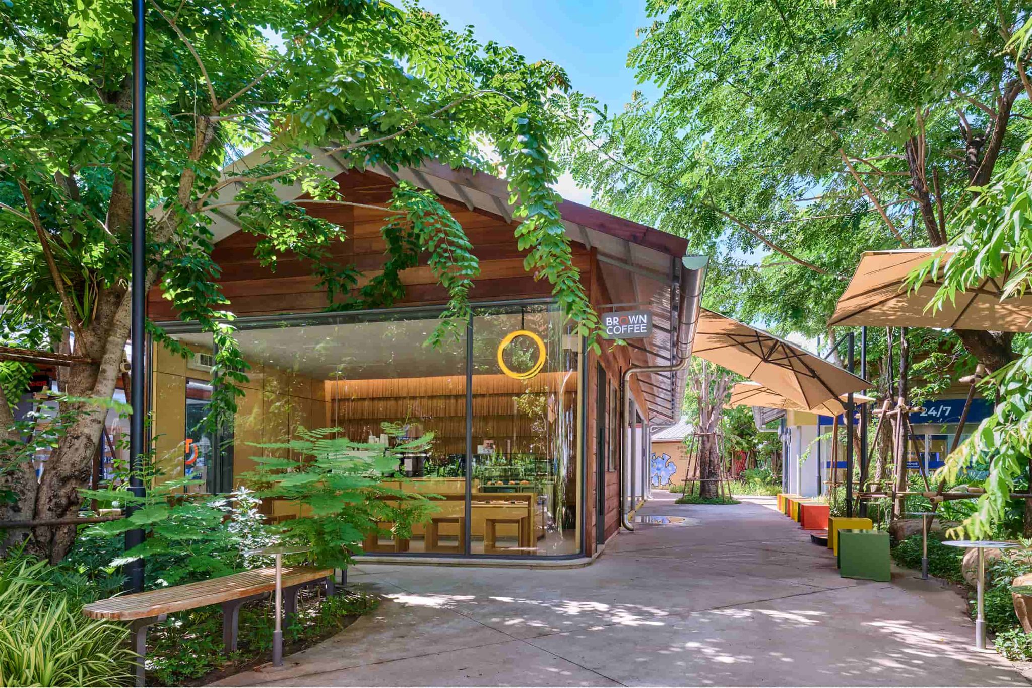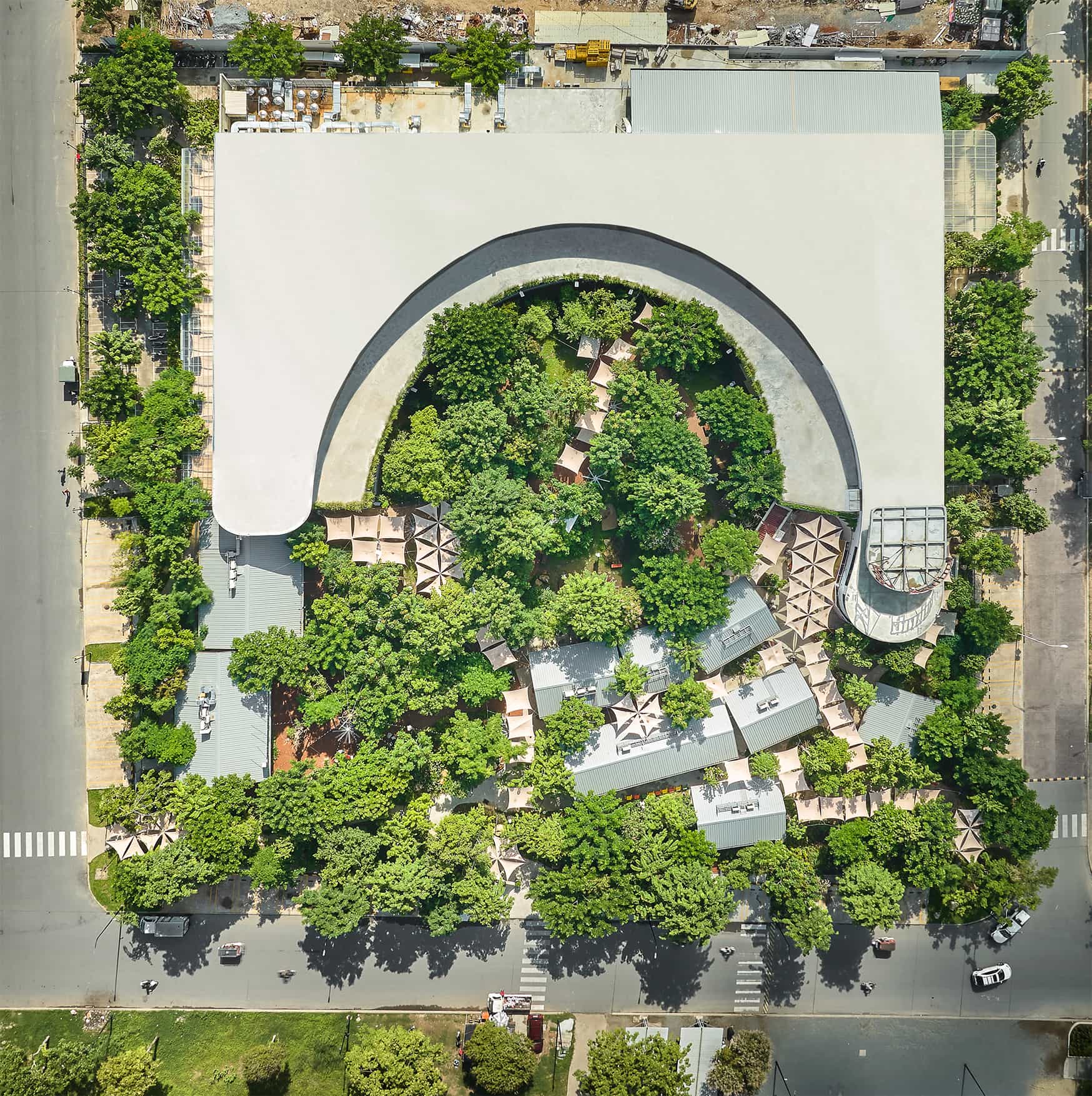 Tree canopies expand, deepening the shade and strengthening the spatial definition of each outdoor room. What initially appears as a newly built environment slowly transitions into a place that feels settled and inhabited, where daily routines begin to shape the atmosphere of the market.