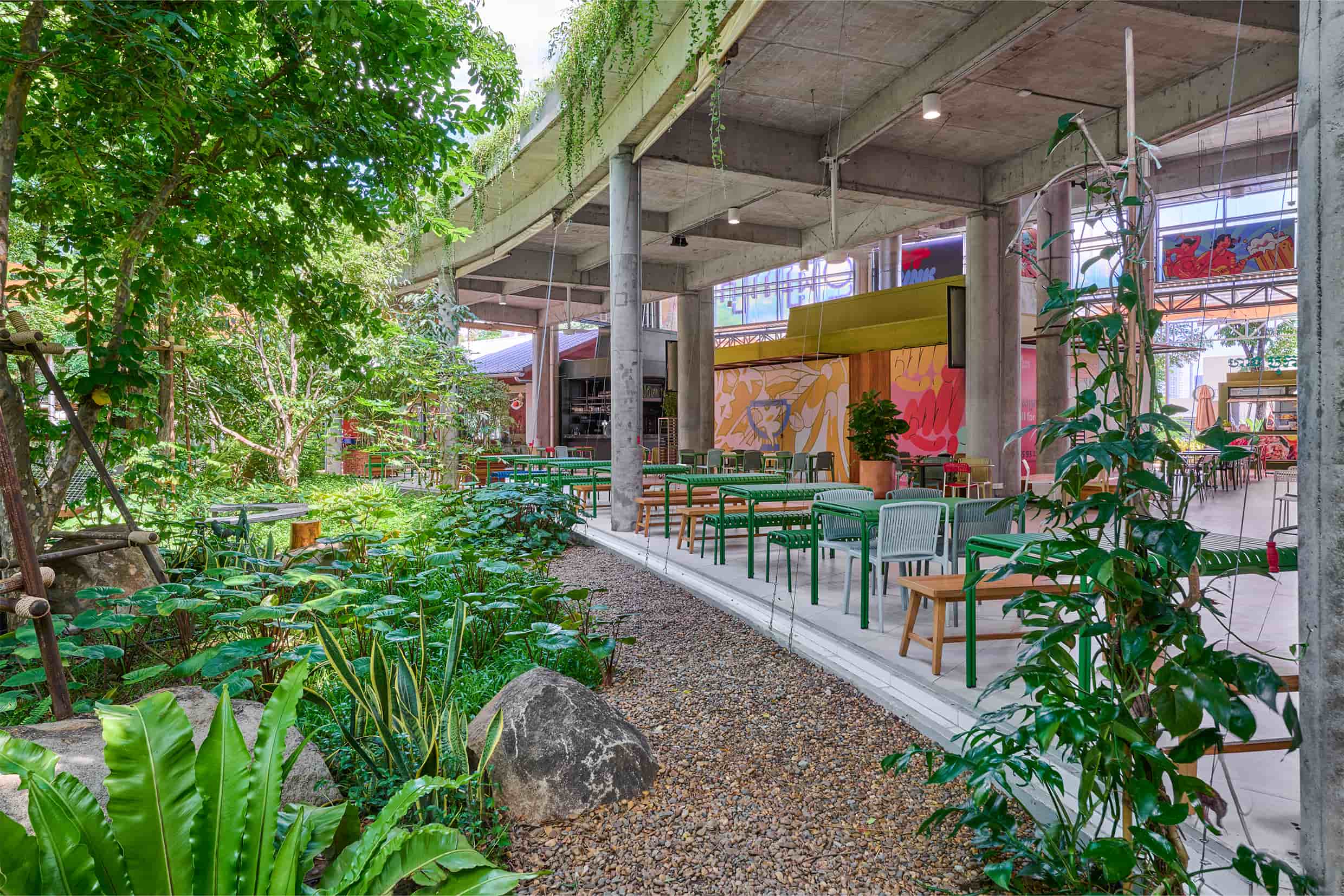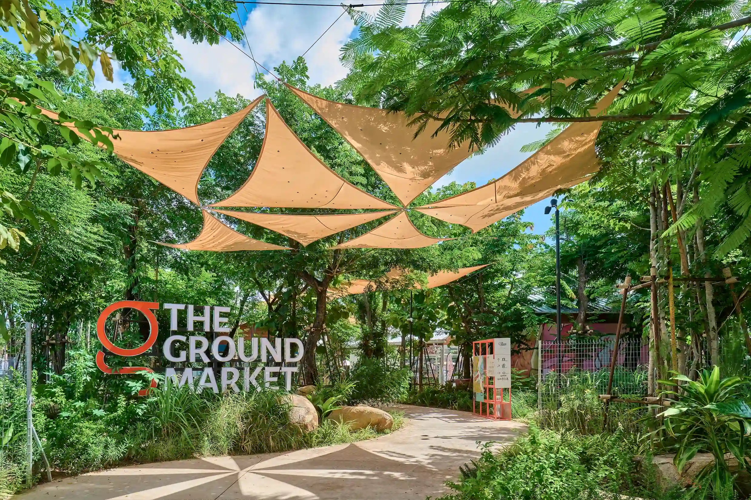 Rather than organizing the site as a single expansive plaza, the landscape strategy structures the market as a sequence of interconnected outdoor rooms. Broad, shaded promenades establish the primary circulation routes, guiding visitors through the site while offering protection from the tropical climate. From these main paths, narrower secondary routes branch outward, leading to quieter seating pockets arranged beneath tree canopies.